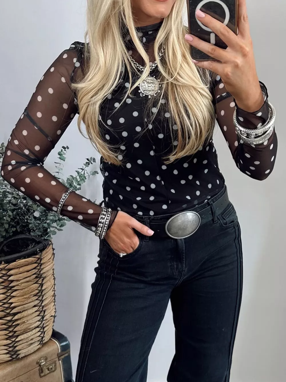 Polka Dot Patterned Bodycon Mock Neck Mesh Long Sleeve Top