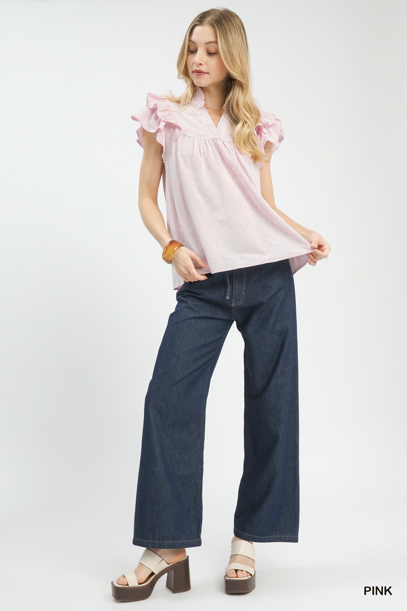 A ruffled sleeve textured blouse exudes feminine charm and sophistication with its delicate ruffled sleeves and textured fabric. The ruffled sleeves add a whimsical and romantic touch to the blouse, elevating its overall look. The textured fabric enhances the visual interest of the blouse, creating a unique and elegant appearance. This blouse is versatile and can be dressed up for formal occasions or styled casually for a chic everyday look. Overall, a ruffled sleeve textured blouse is a beautiful wardrobe staple that brings a touch of refinement and grace to any outfit.