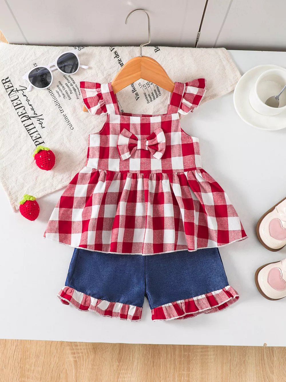 Children's Gingham Bowknot Ruffle Trim Top and Shorts Set