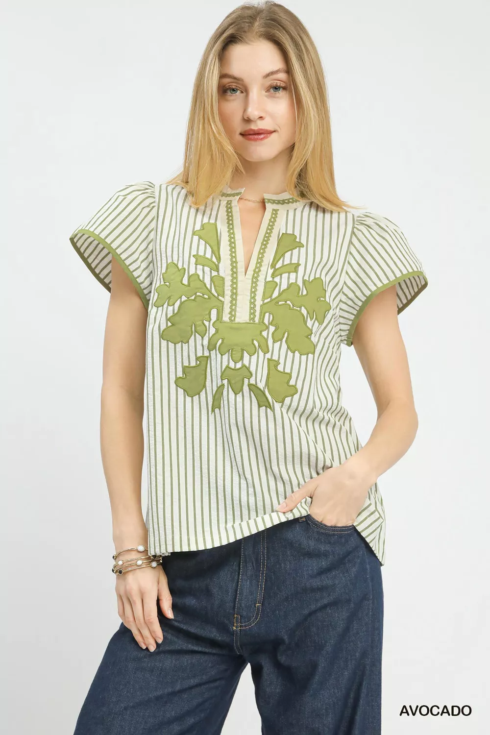 This stylish blouse shirt features a classic striped pattern and delicate embroidered floral detailing, adding a touch of elegance to your wardrobe. The V-neckline and short sleeves offer a comfortable and flattering fit, perfect for warm weather. Made from a lightweight and breathable fabric, this top is ideal for everyday wear. The relaxed fit ensures all-day comfort, while the easy-care material makes it a practical choice. Pair it with jeans or skirts for a versatile and chic look. The main material is cotton blend.