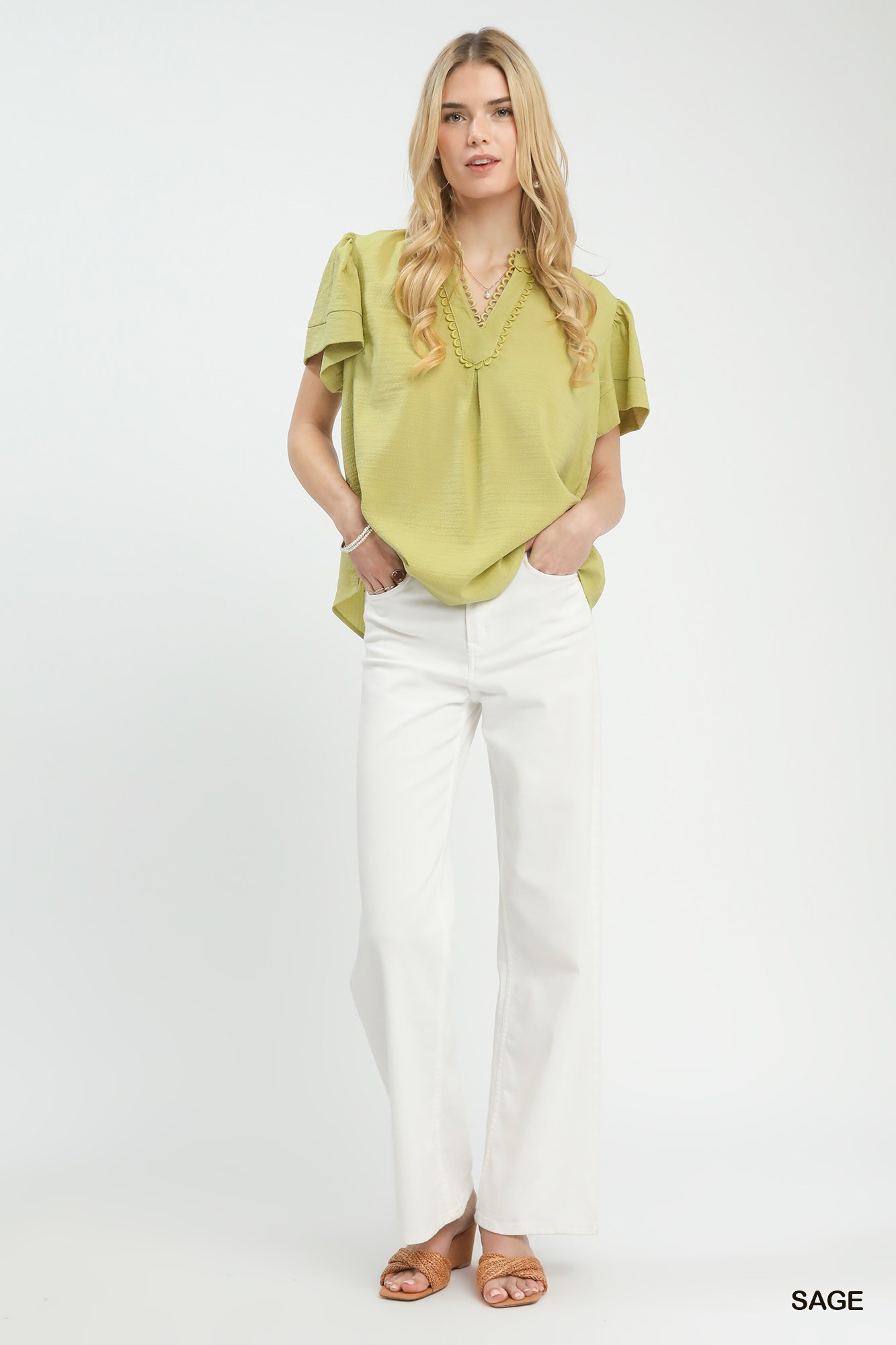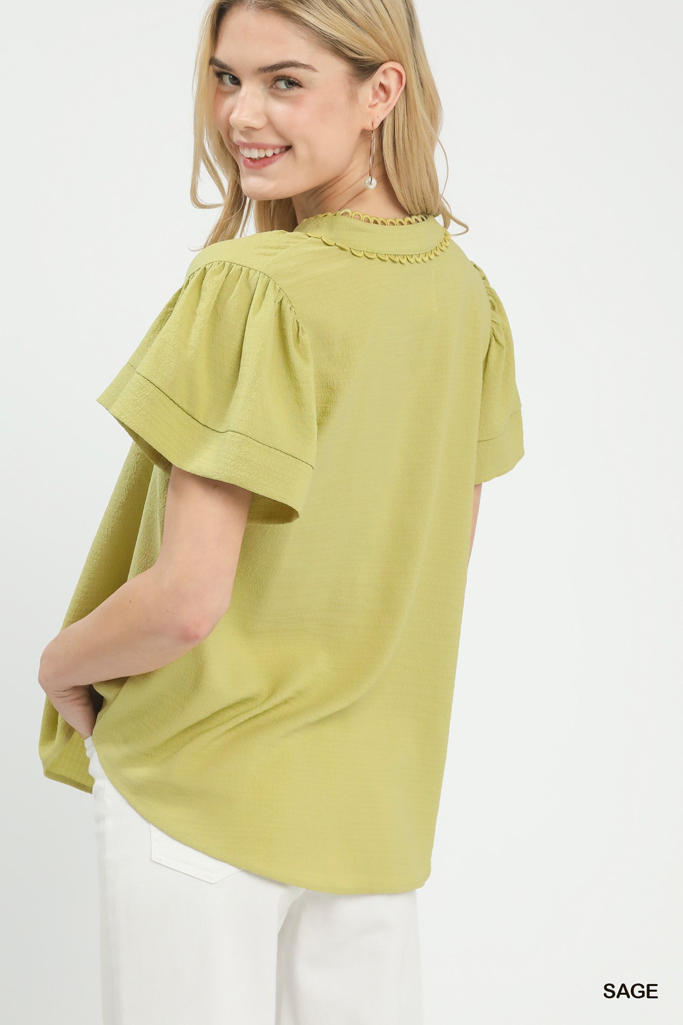 Introducing the Seersucker Short Sleeve Top, a perfect blend of charm and comfort for the season. Crafted from seersucker fabric with delicate lace trim, this top exudes a classic yet feminine aesthetic. The split V-neck with scalloped trim detail adds an elegant touch to the design. Flutter-style sleeves enhance the breezy feel of this top, making it a stylish choice for any casual outing. With its lightweight construction, this top will keep you cool and stylish all day long.