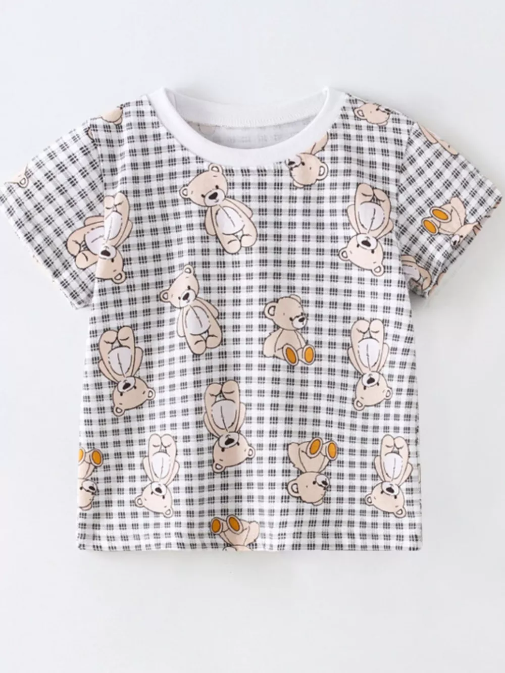 Children's Plaid Bear Print Crew Neck Short Sleeve T-Shirt
