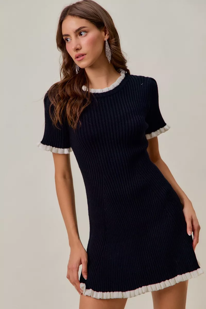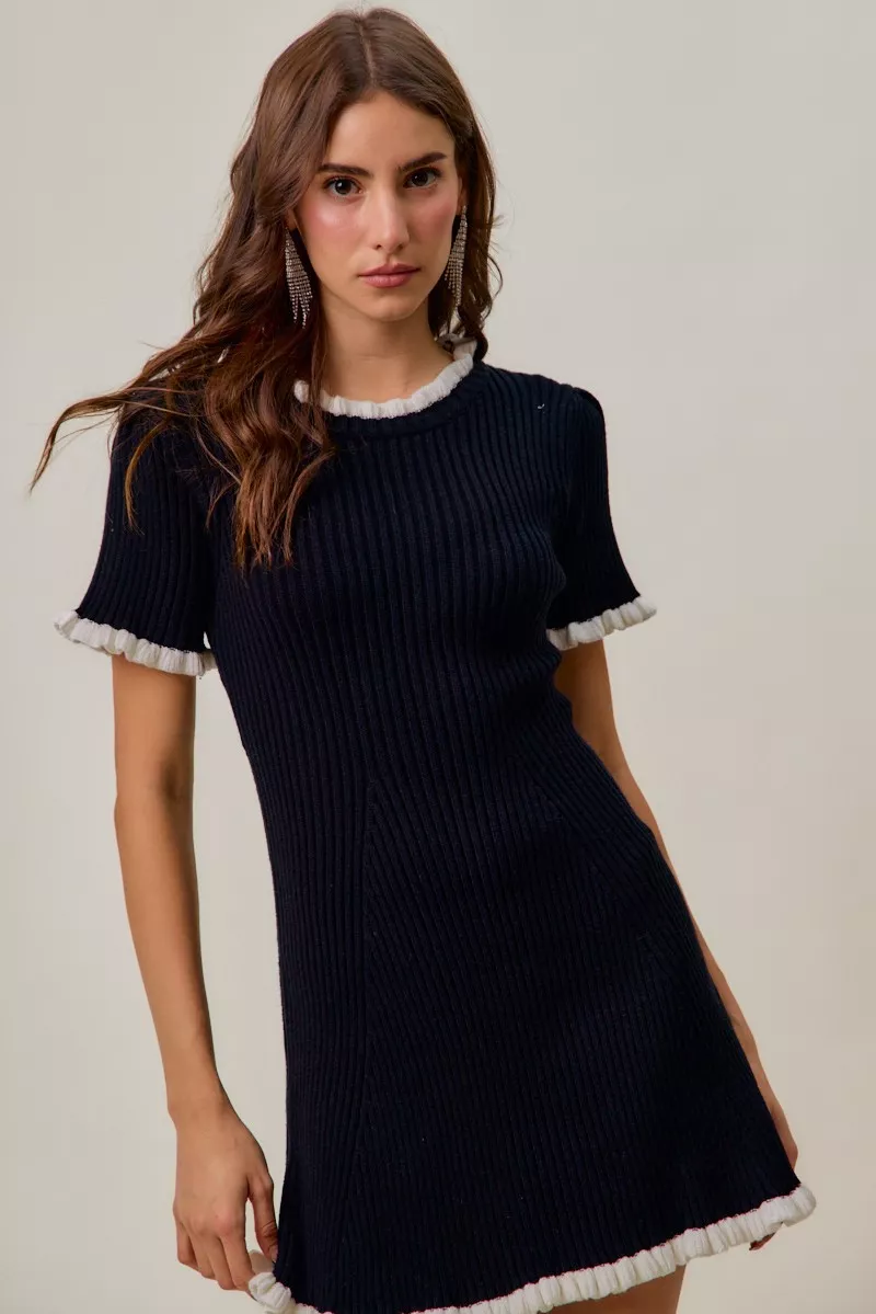 SO ME Contrast Ruffled Sweater Knit Mini Dress