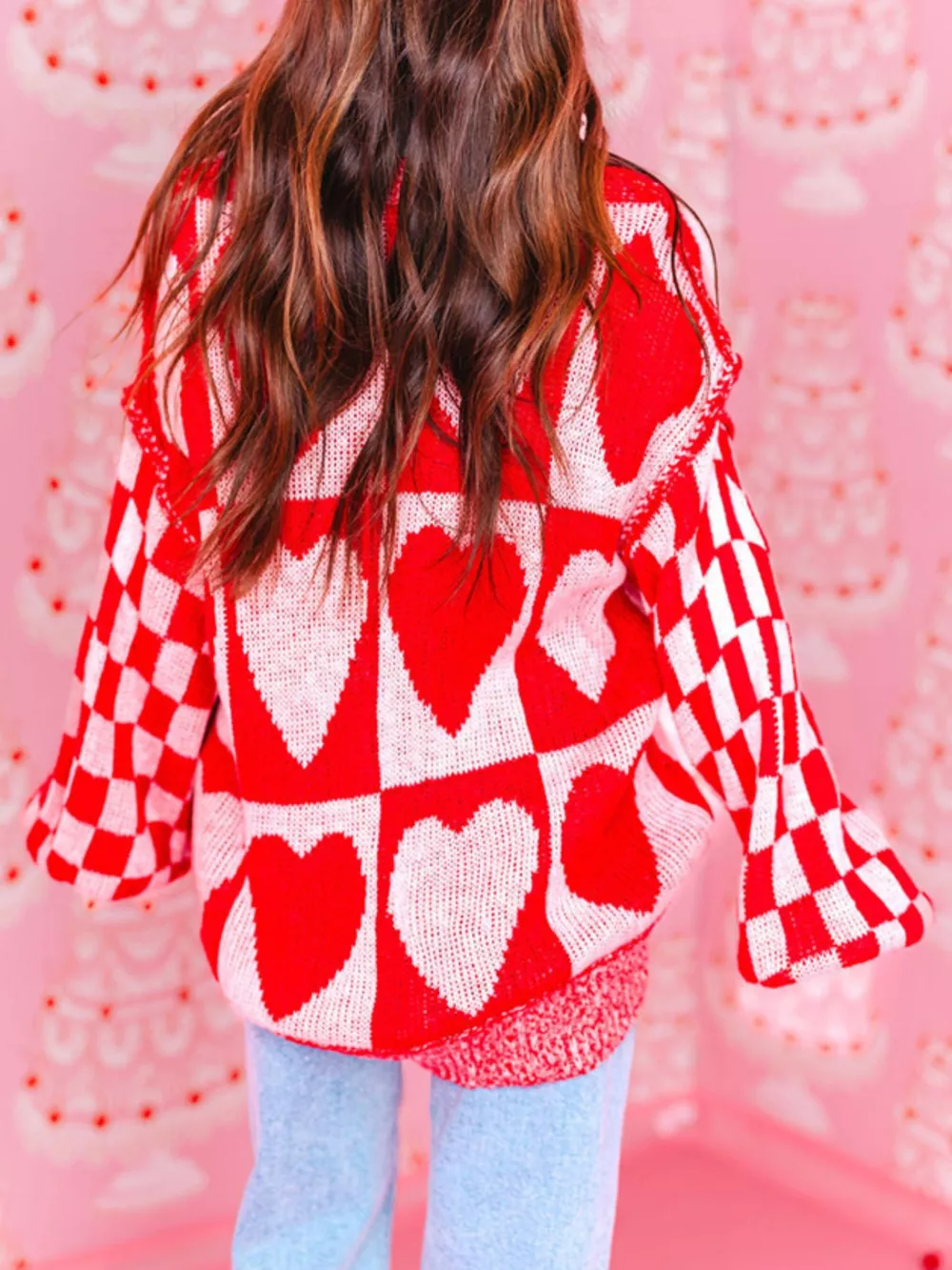 Heart Pattern Checkerboard Knit Sweater