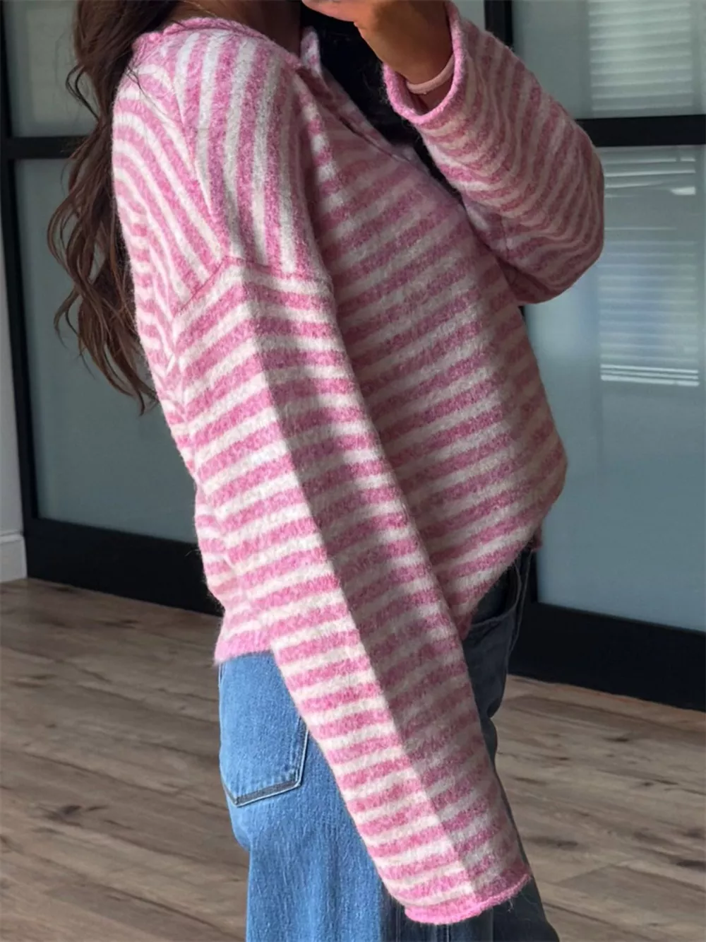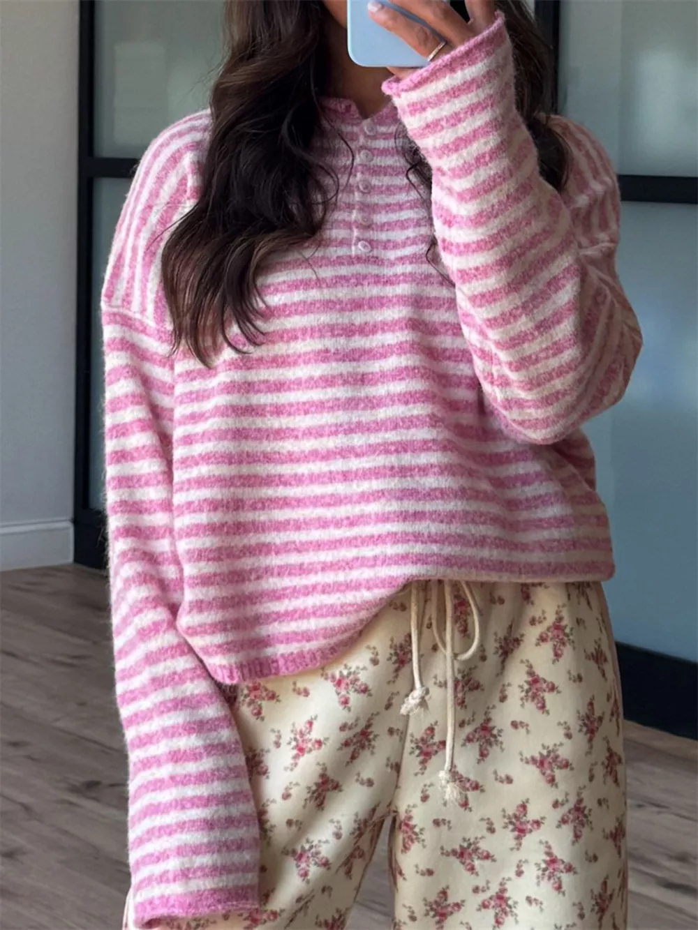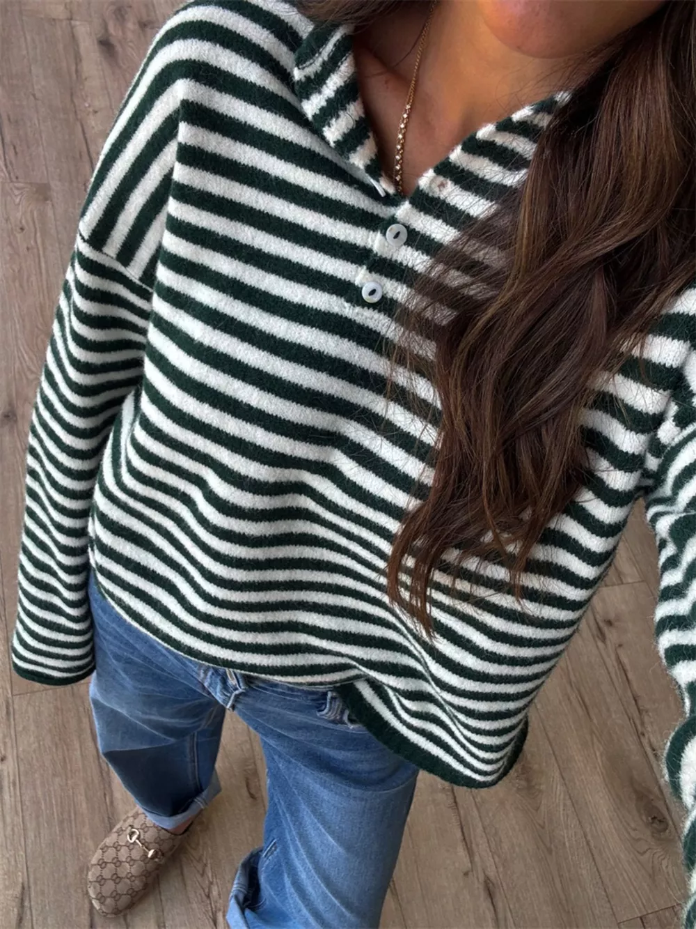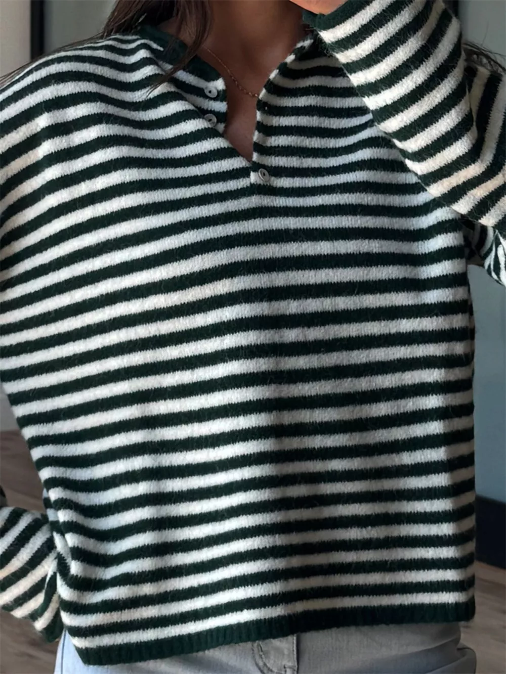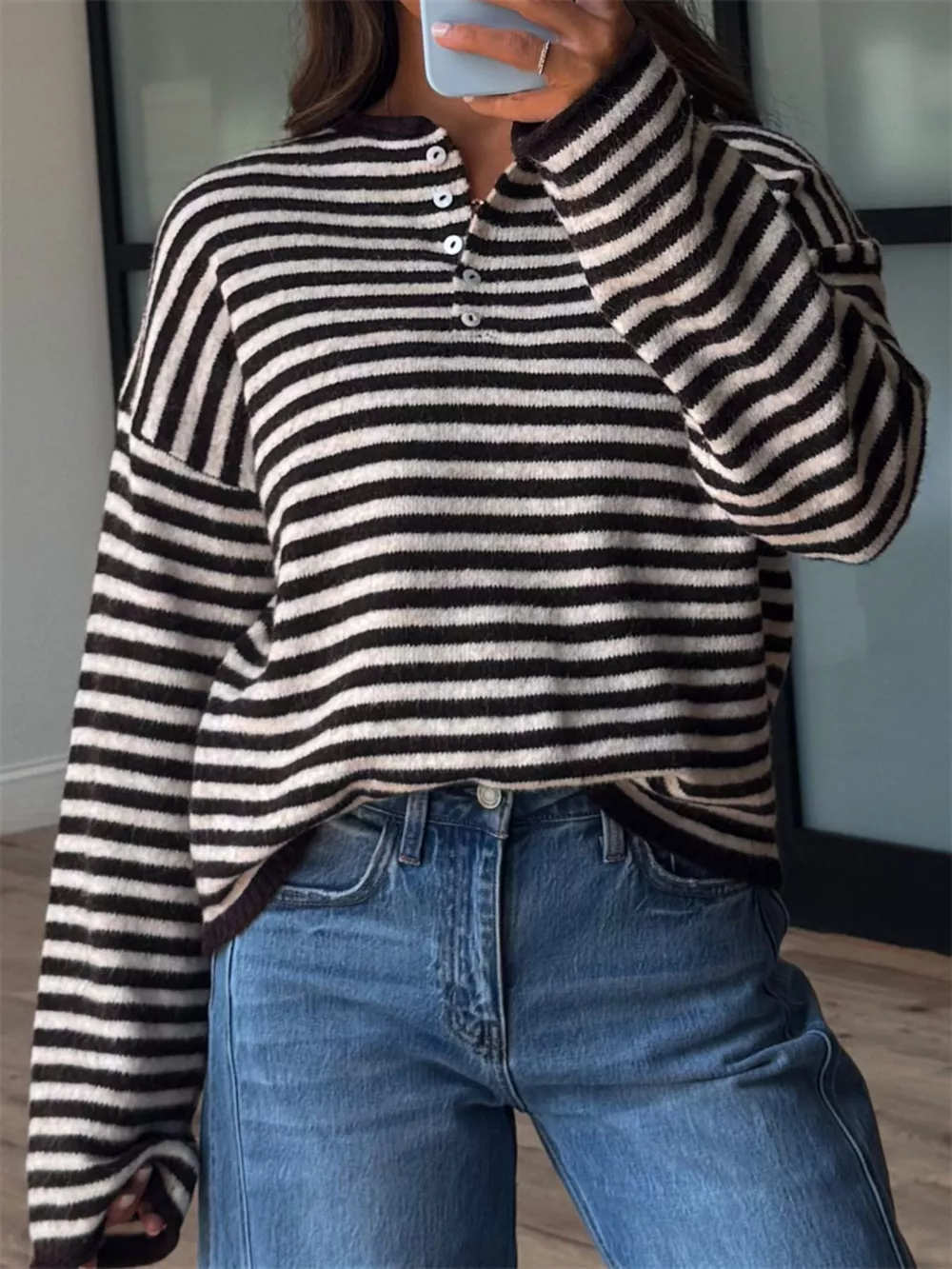 Button Detail Dropped Shoulder Striped Sweater