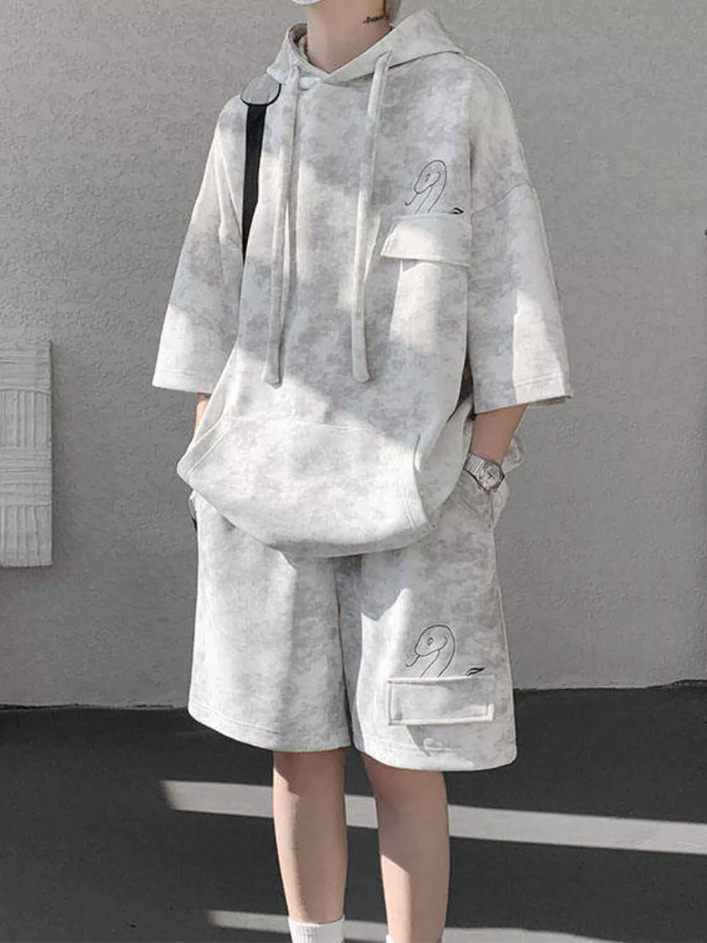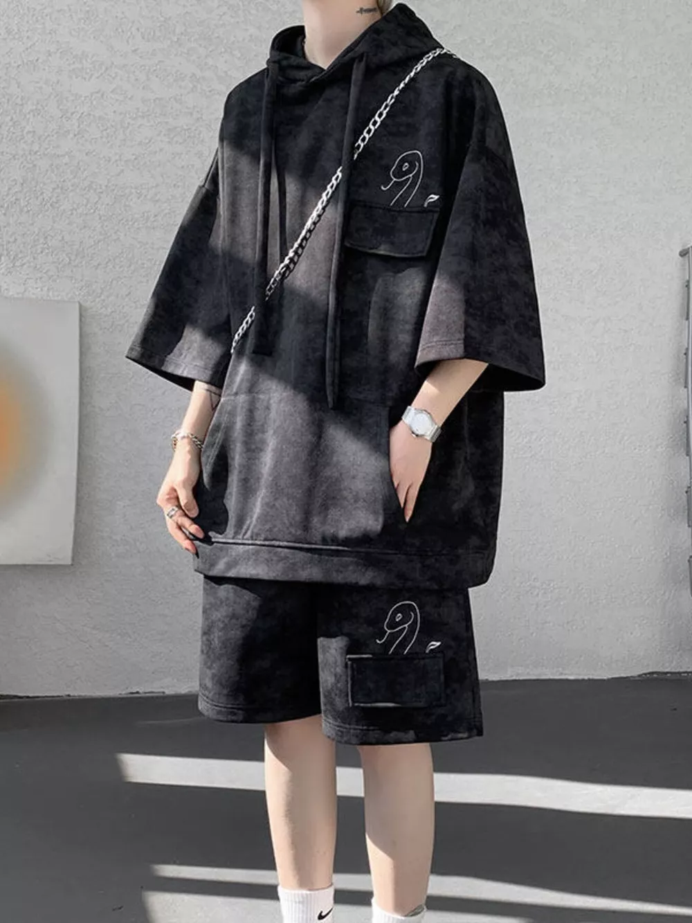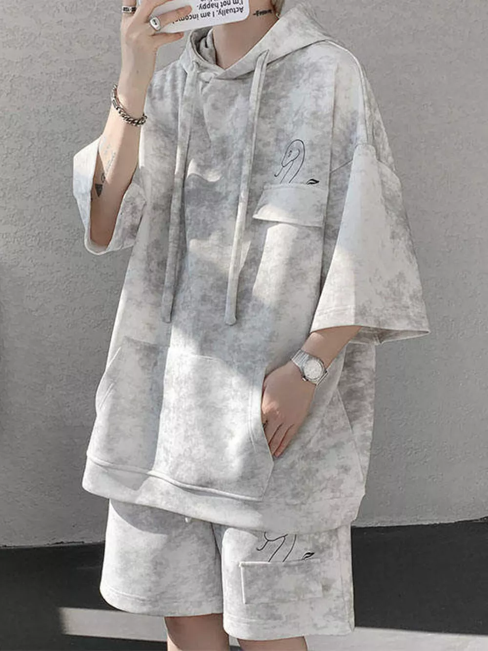 Men's Plus Size Casual Washed Hoodie & Shorts Set