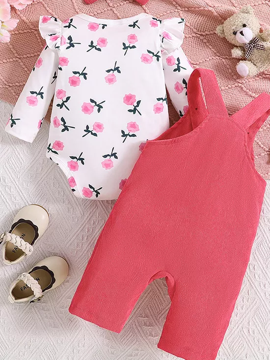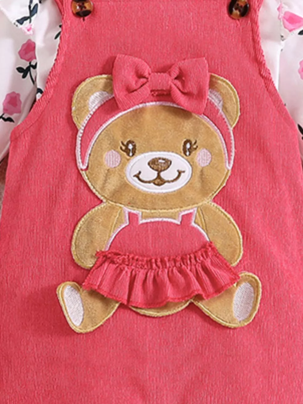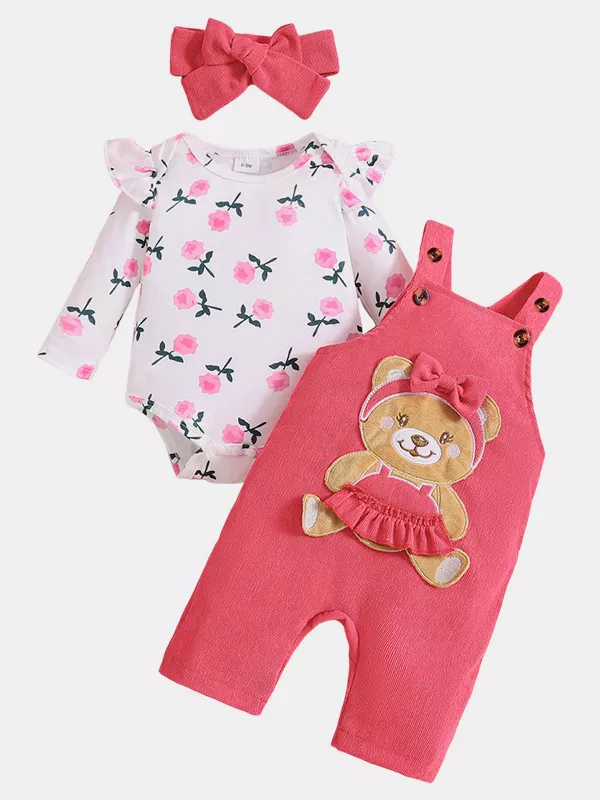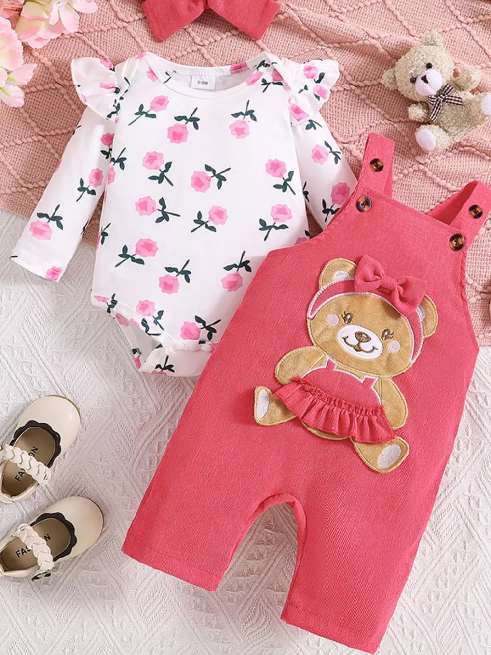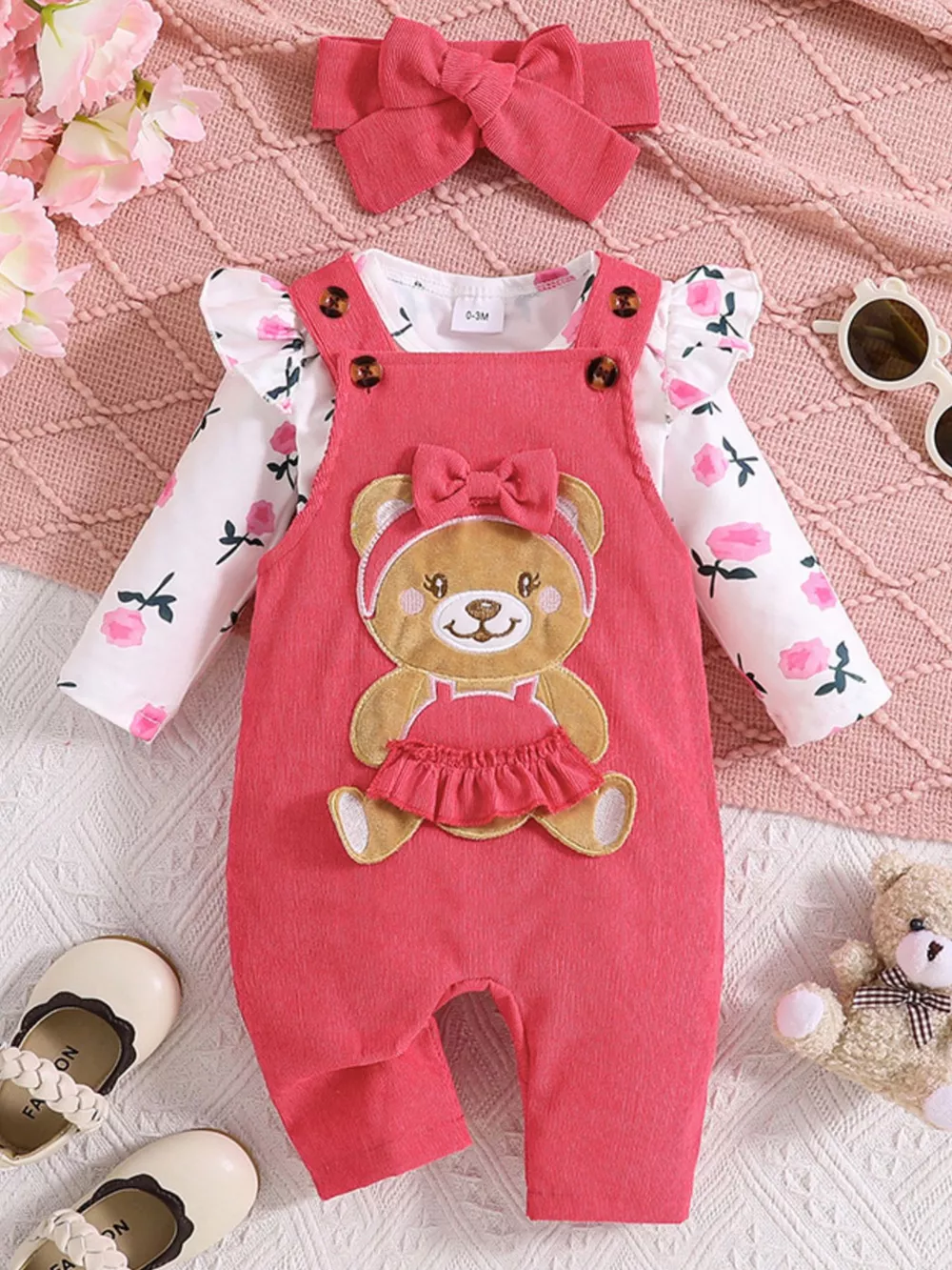 Children's 3-Piece Bear Applique Corduroy Overalls and Floral Bodysuit Set with Headband