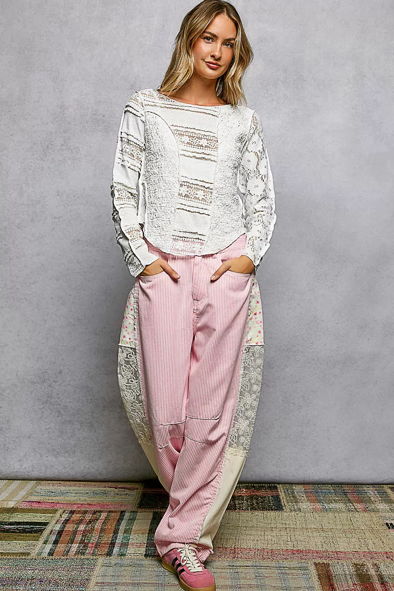 POL Round Neck Long Sleeve Exposed Seam Top with Lace Detail