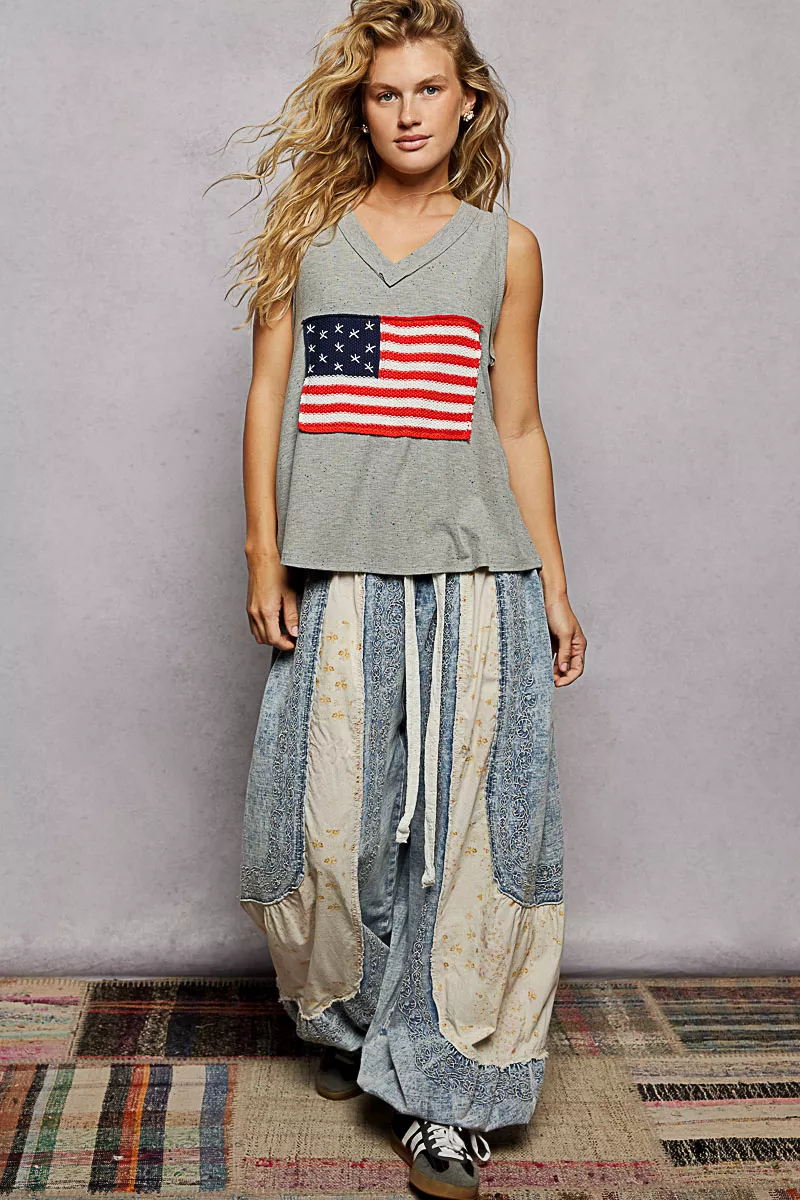 This V-neck sleeveless top features a relaxed fit and ribbed texture for a comfortable and casual style. The handcrafted American flag patch on the front adds a patriotic touch to the design. The star back patch enhances the unique and special look of the top. With outseam details and normal washing care, this top offers quality craftsmanship and easy maintenance. The solid color makes it easy to pair with a variety of bottoms for a stylish and versatile ensemble. Embrace the individuality and charm of this sleeveless top with its special design elements.