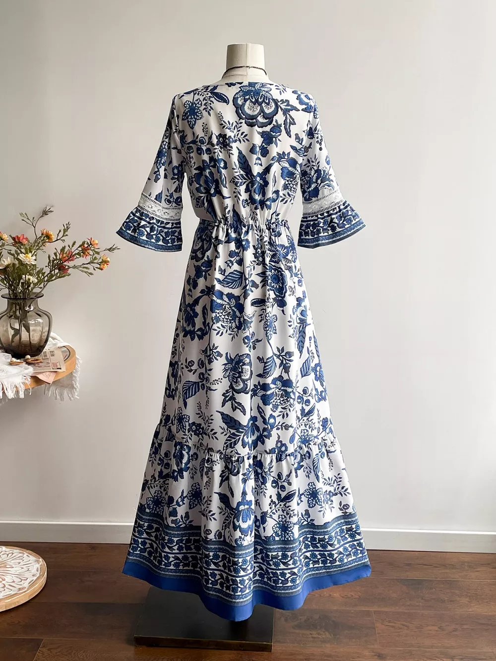 Floral Print V-Neck Flounce Sleeve Dress