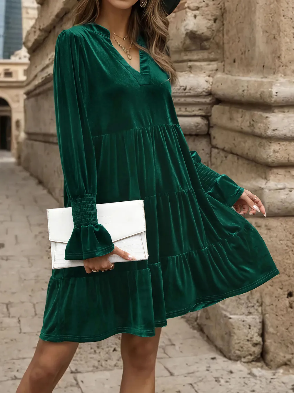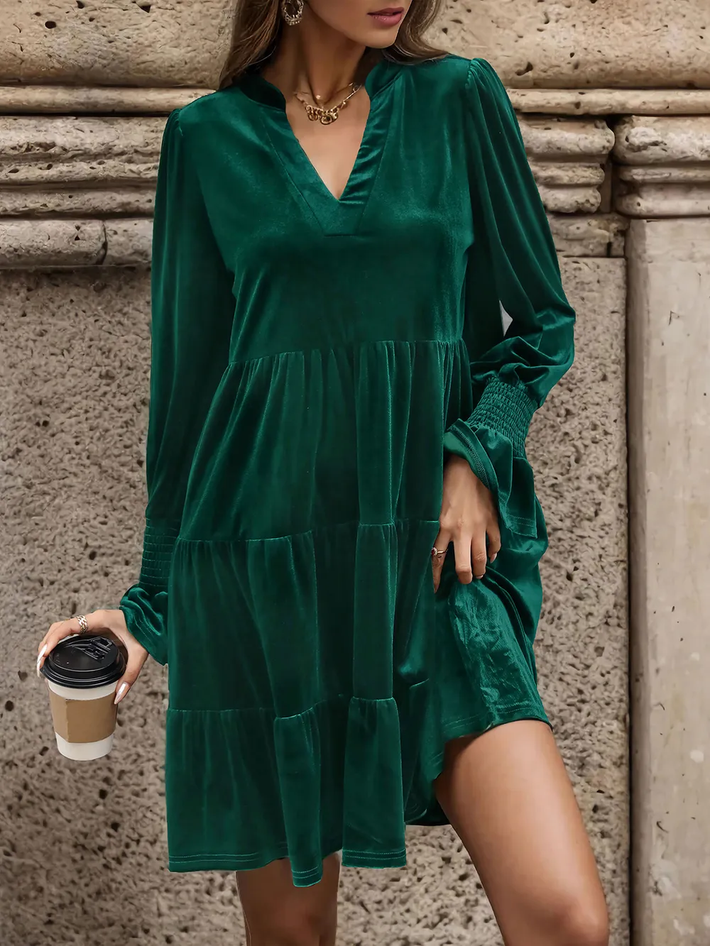 Detailed description of the Perfee Notched Long Sleeve Tiered Dress, highlighting quality, design, and unique features that make it appealing to end consumers.
