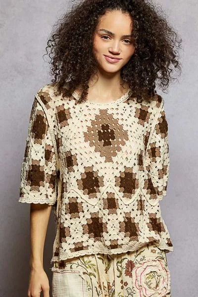 POL Round Neck Short Sleeve Color Pattern Crochet Top with Border Accents