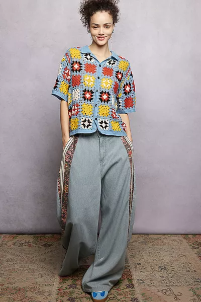 POL Button Down Openwork Floral Crochet Shirt with Granny Square Pattern