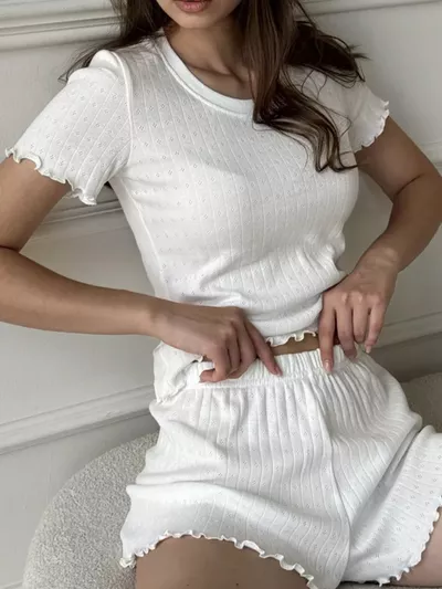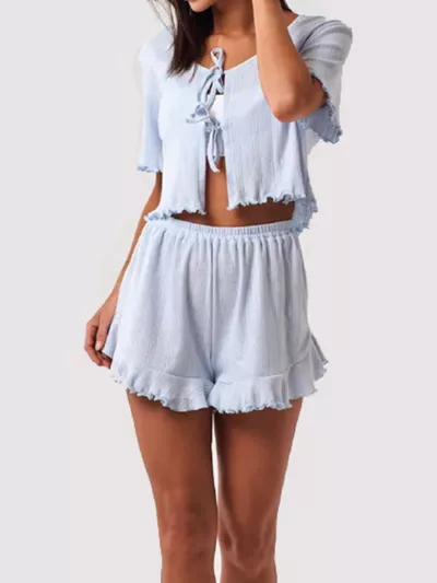 Color Block Patchwork Textured Long Sleeve Top and Short Lounge Set