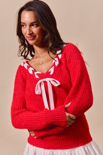 Bow Print Ribbed Trim Exposed Seam Drop Shoulder Loose Sweater