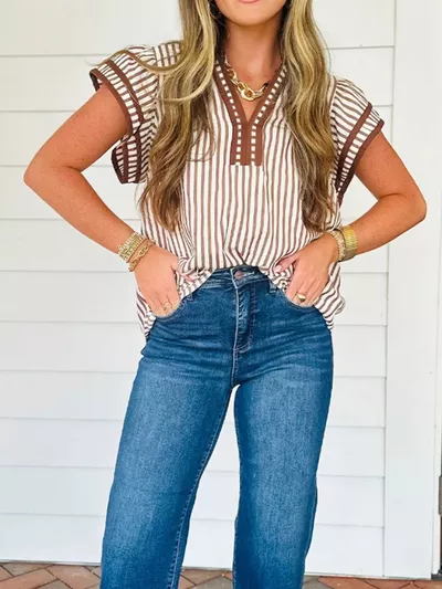 Double Take Full Size Geometric Notched Dolman Sleeve Top