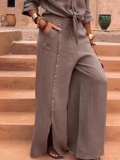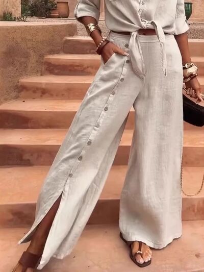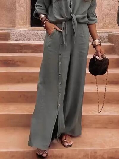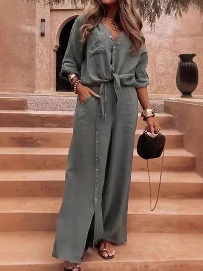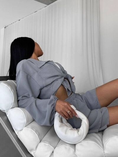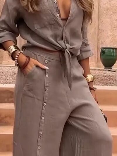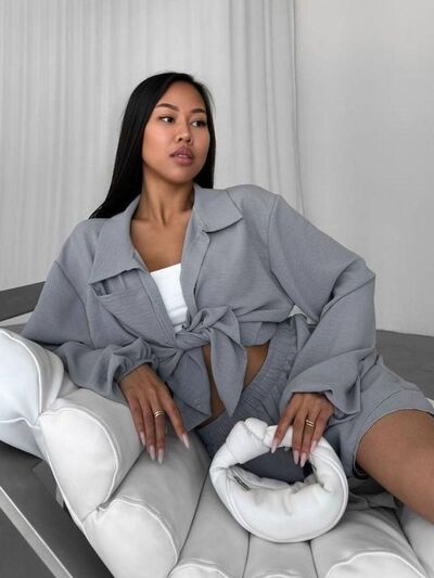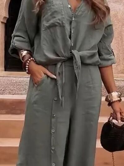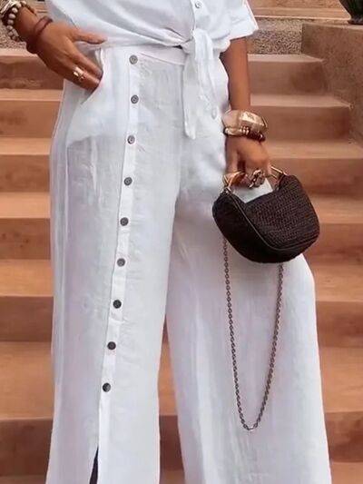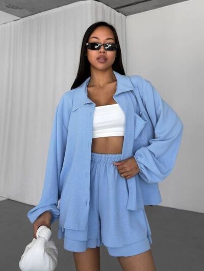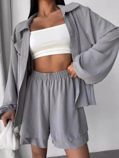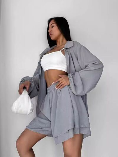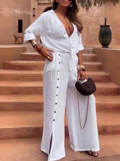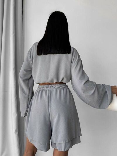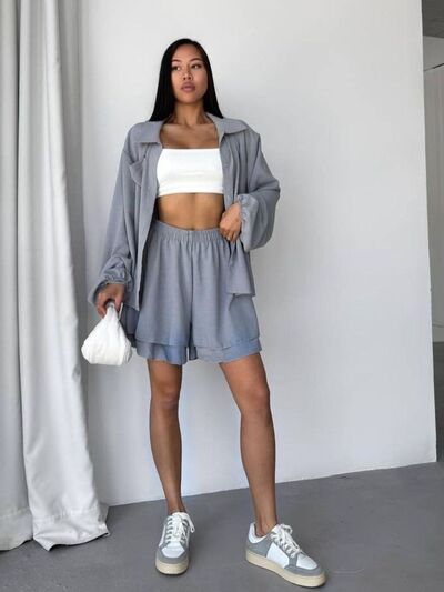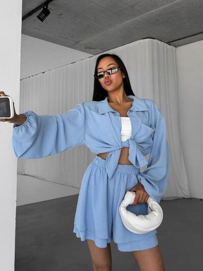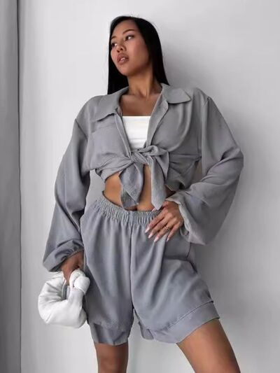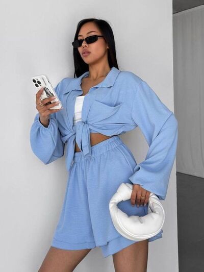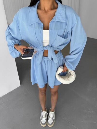 Collared V Neck Tee Drawstring Elastic Waist Shorts 2pcs Outfit