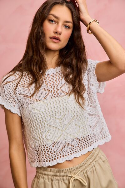 Openwork Round Neck Half Sleeve Knit Cover Up