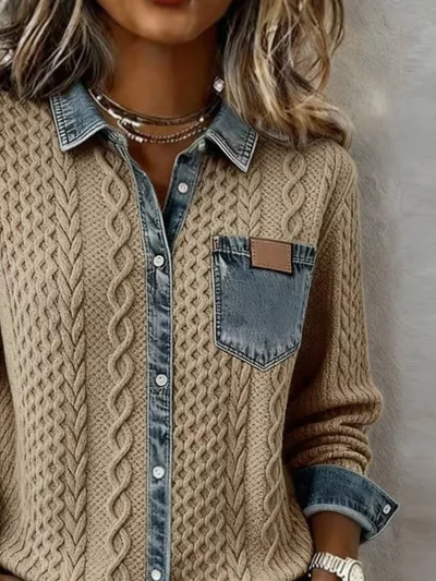 Full Size Denim Trim Long Sleeve Top Plus Size