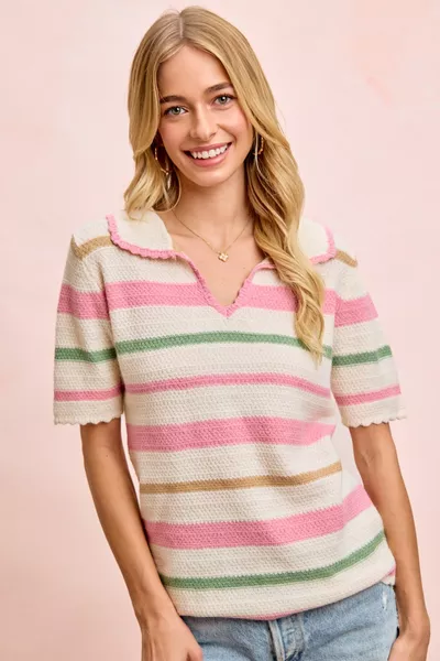 Striped Trim Short Sleeve Knit Top with Striped Chest Pocket
