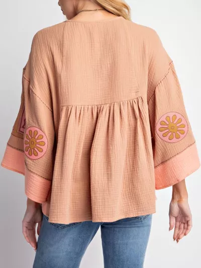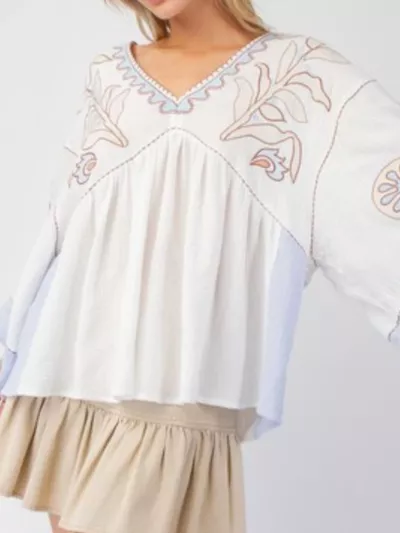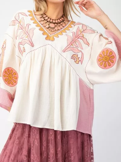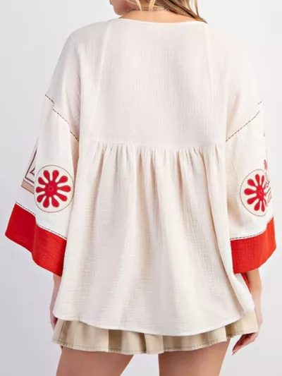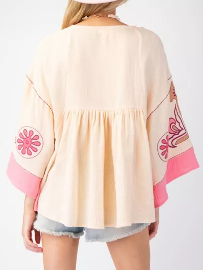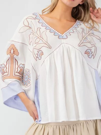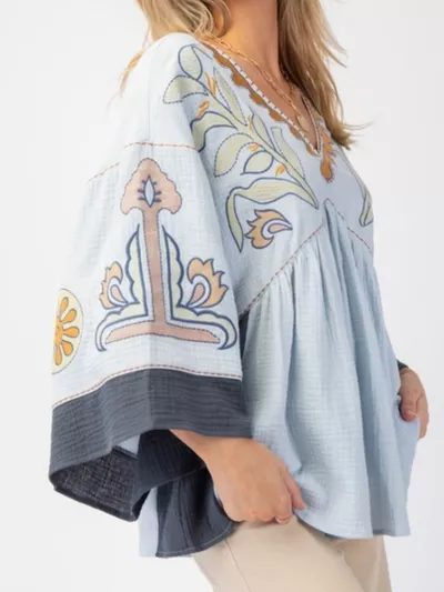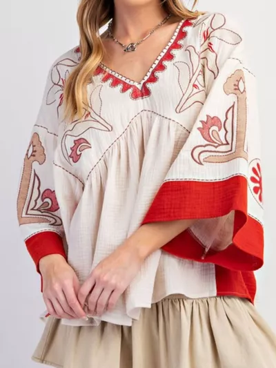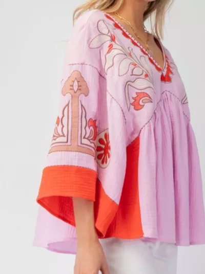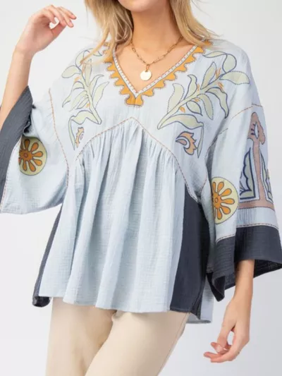 Printed V-Neck Top with Contrast Trim Details