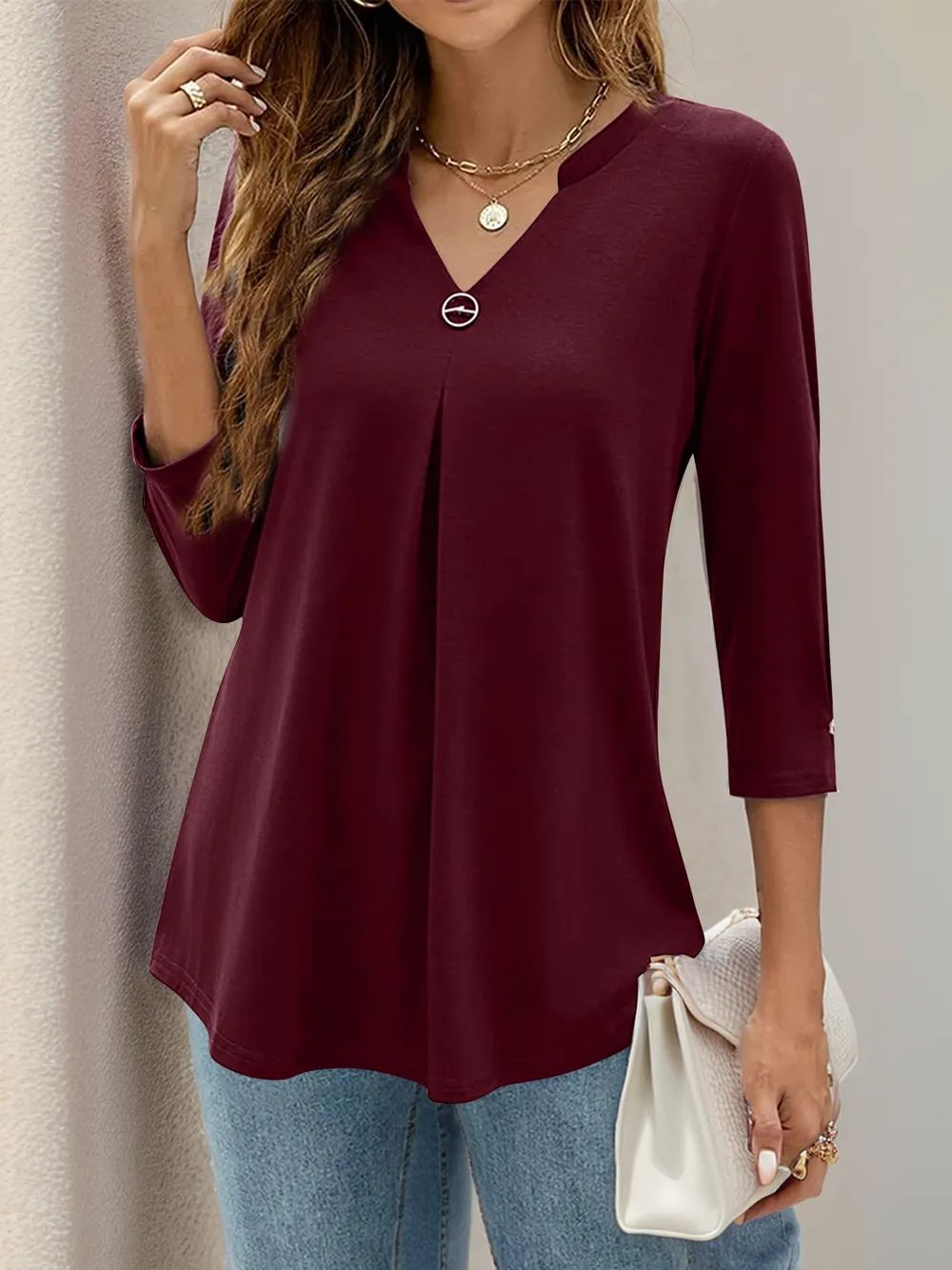 Notched Three-Quarter Sleeve T-Shirt