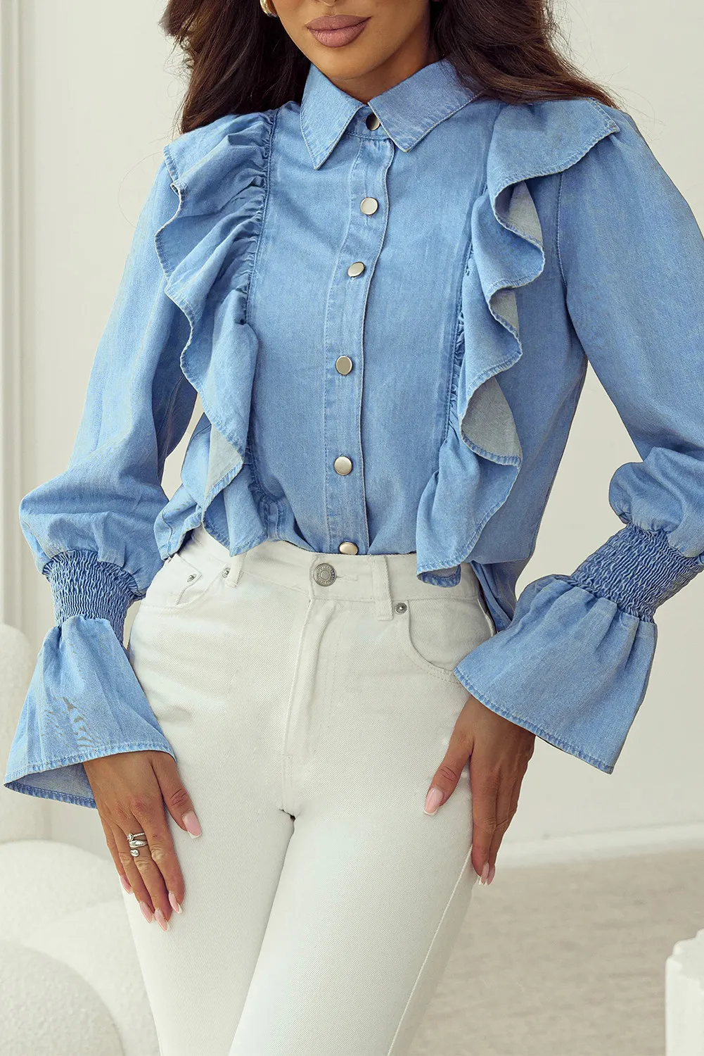Ruffled Button Up Long Sleeve Denim Top