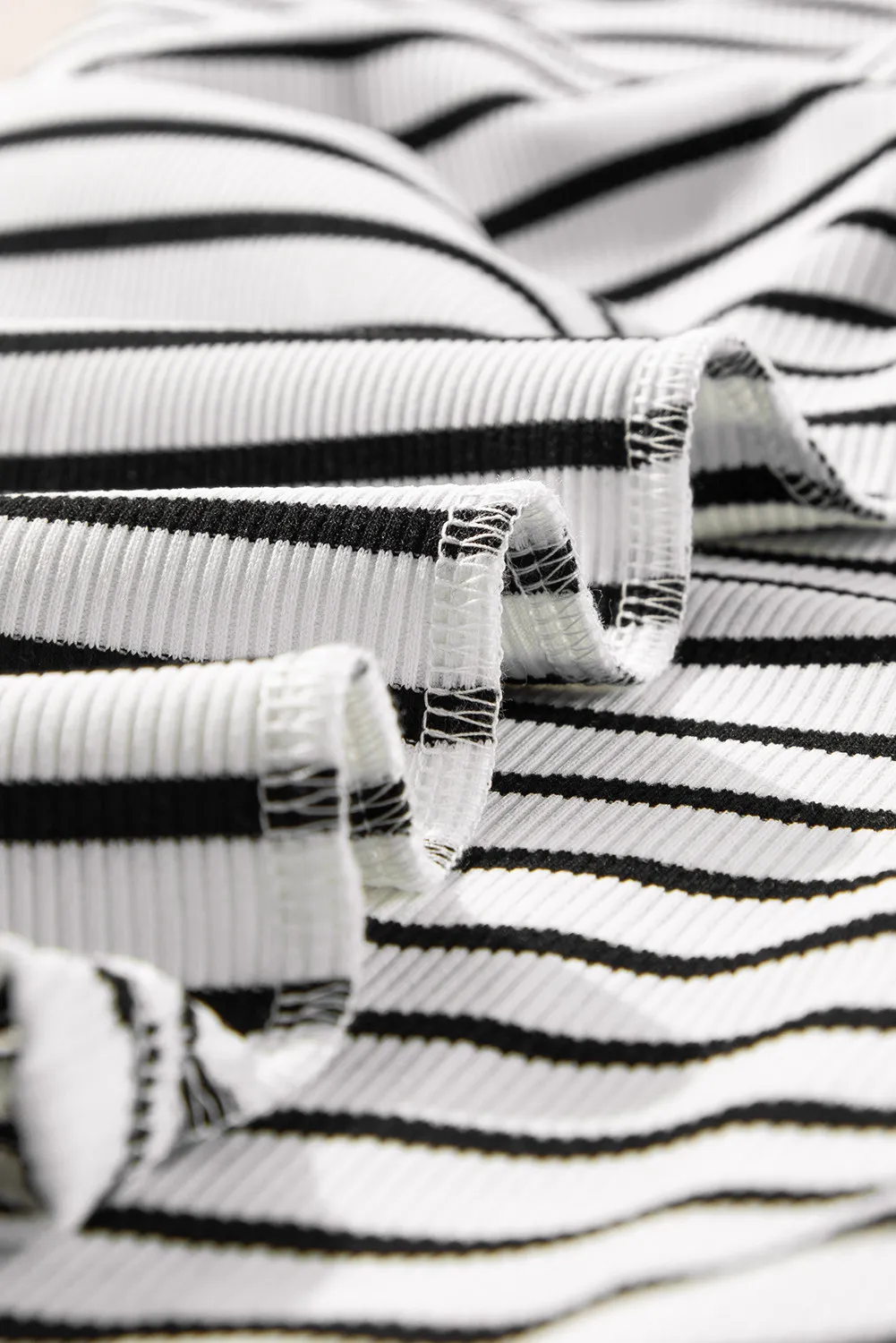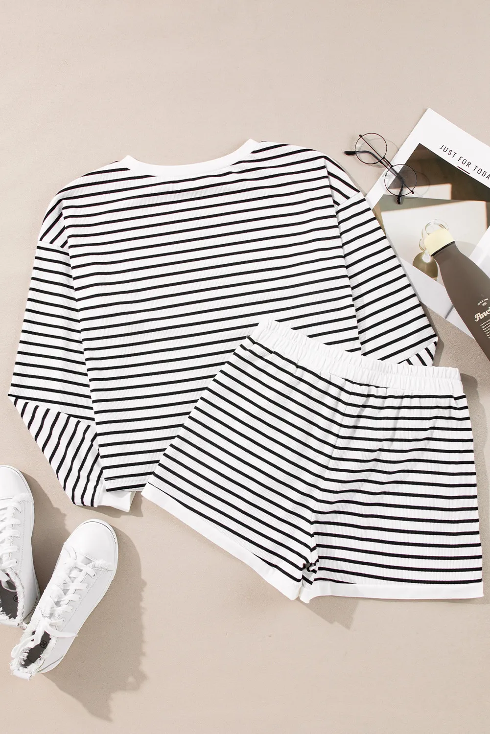 Striped Round Neck Long Sleeve Top and Shorts Set