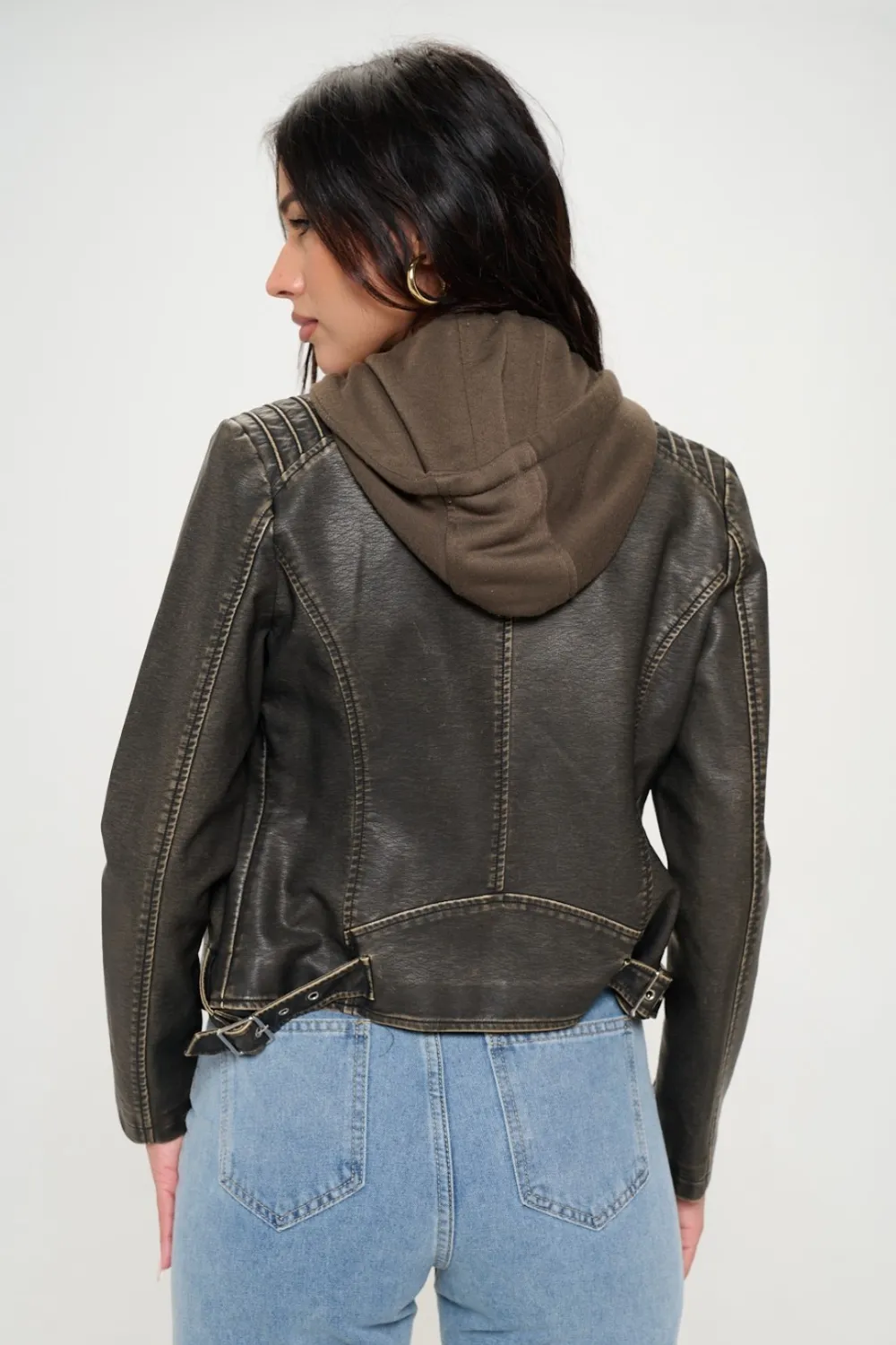 This zip-up hooded jacket is crafted from vegan leather for a stylish and sustainable option. The zip-up pocket adds a practical touch for storing essentials. The hood offers extra warmth and versatility for different weather conditions. Ideal for those seeking a chic and cruelty-free fashion statement. This jacket is a fashionable and functional addition to any wardrobe.