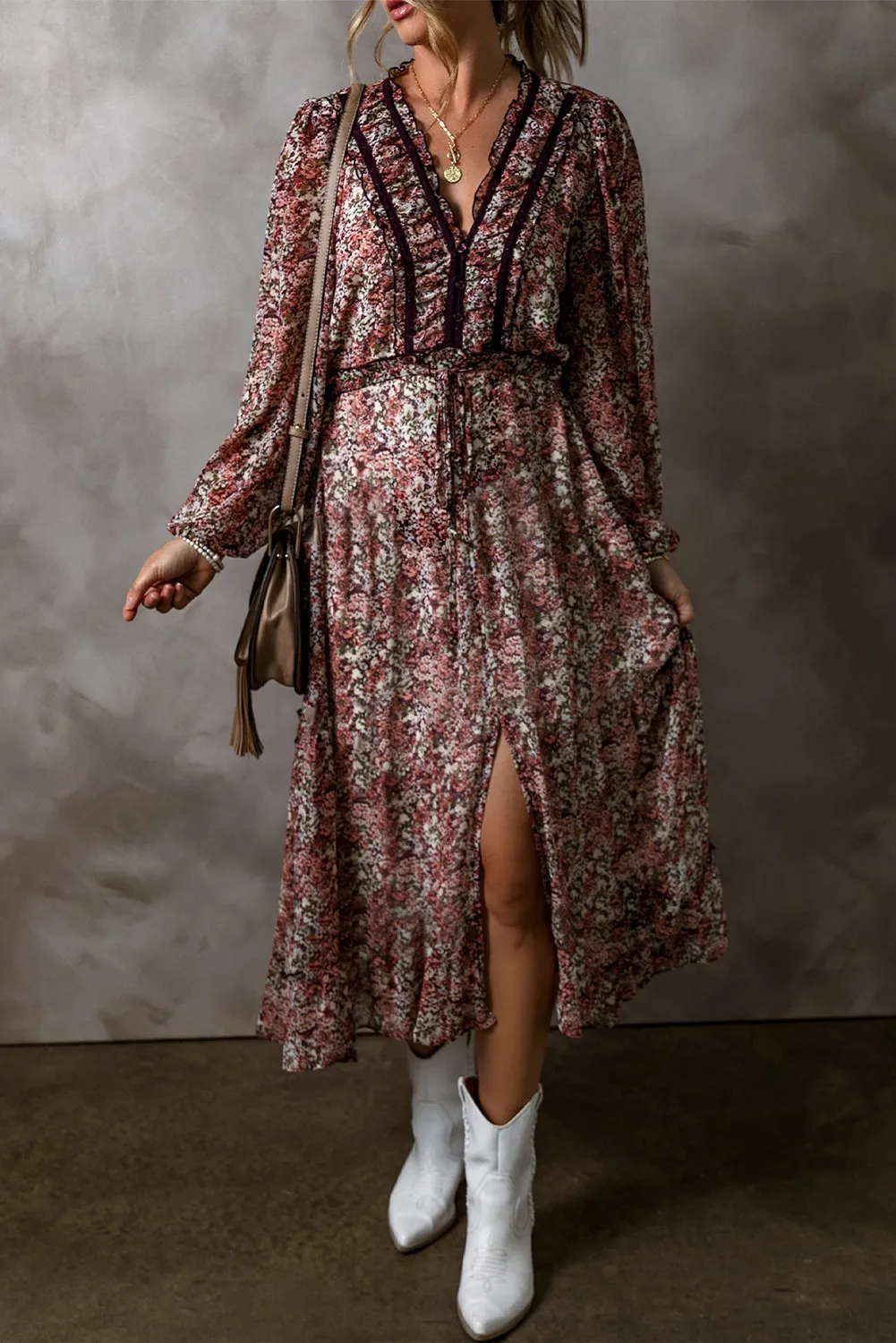 Frill Printed V-Neck Long Sleeve Midi Dress