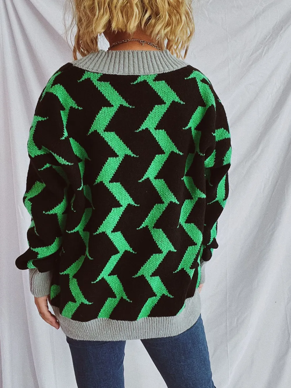 Contrast Trim Geometric V-Neck Long Sleeve Cardigan