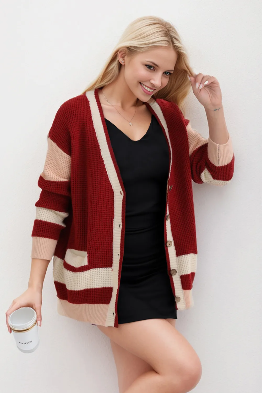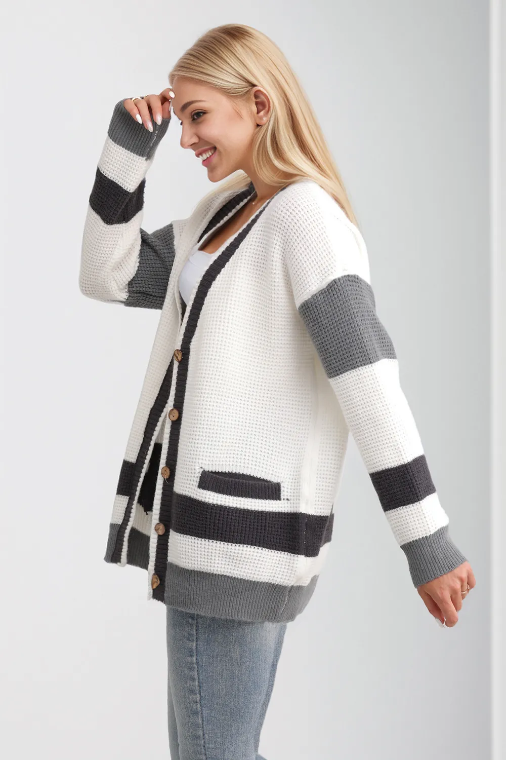 Pocketed Contrast V-Neck Long Sleeve Cardigan