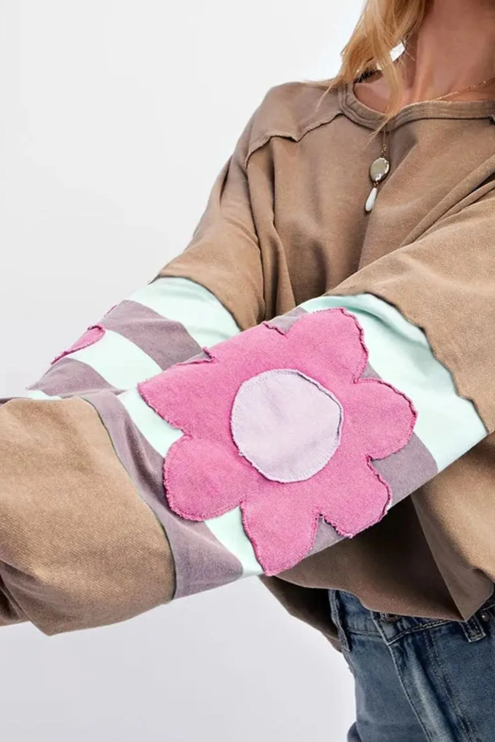 Plus Size Flower Round Neck Long Sleeve Blouse
