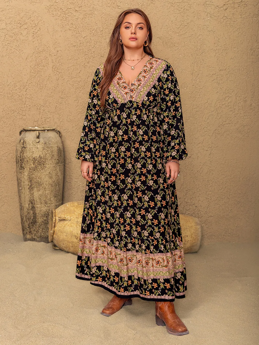 Plus Size Floral V-Neck Balloon Sleeve Dress