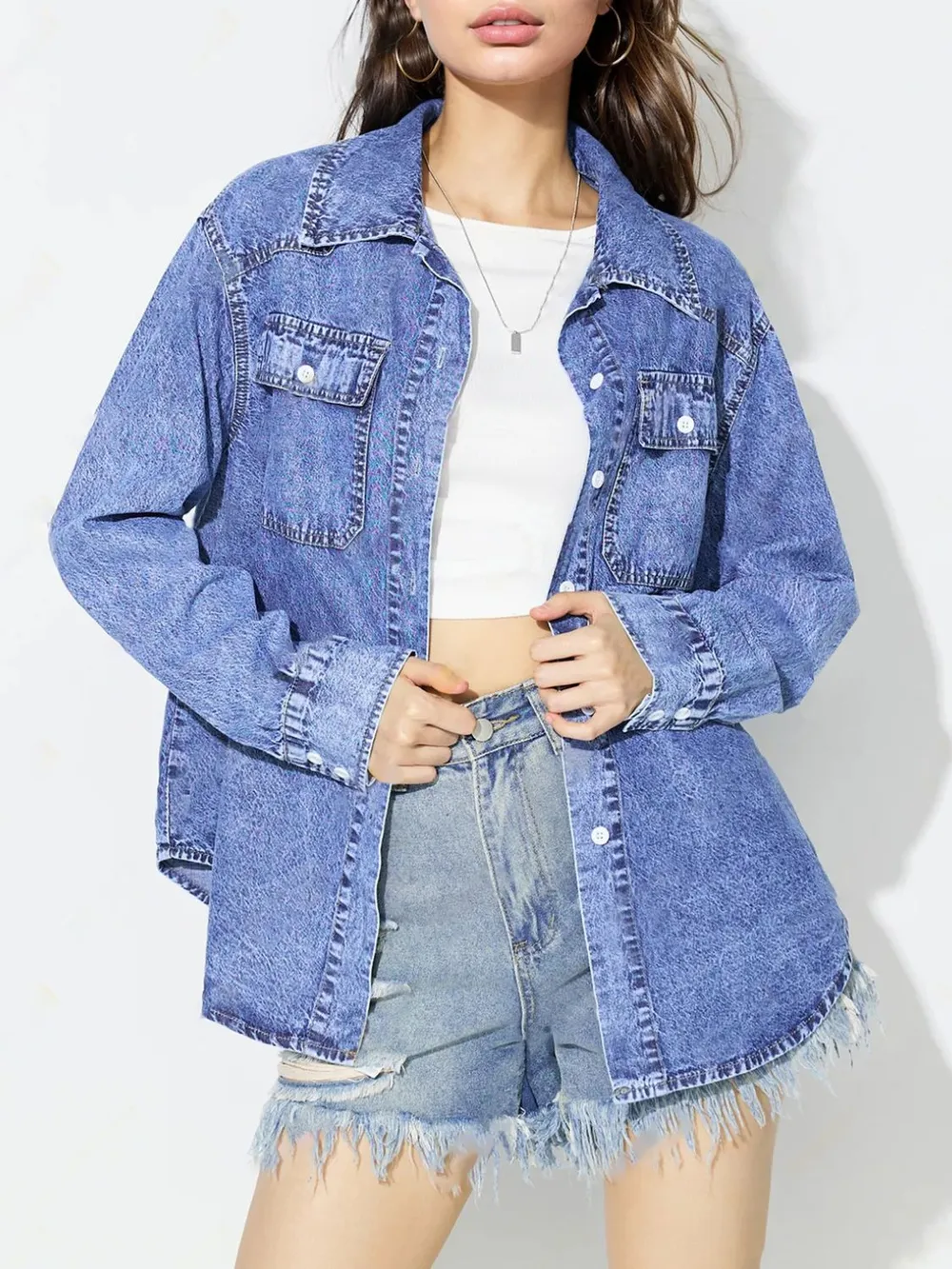 Curved Hem Collared Neck Denim Top