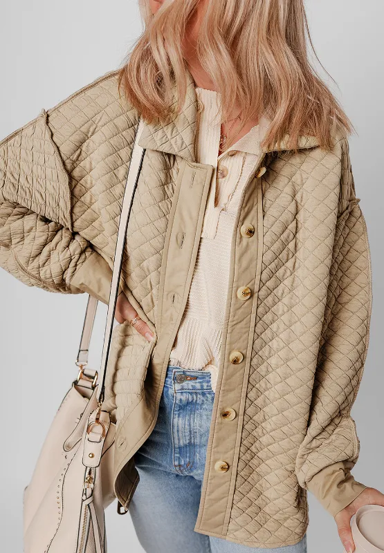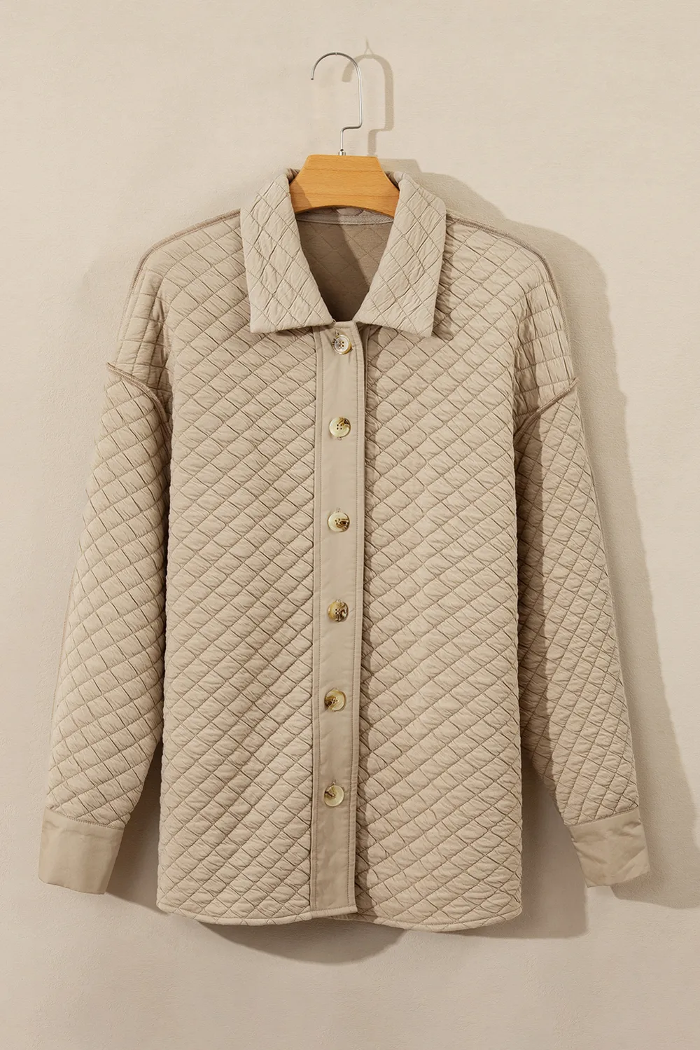 Detailed description of the Exposed Seam Collared Neck Button Up Shacket, highlighting quality, design, and unique features that make it appealing to end consumers.