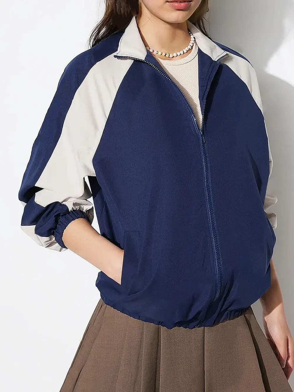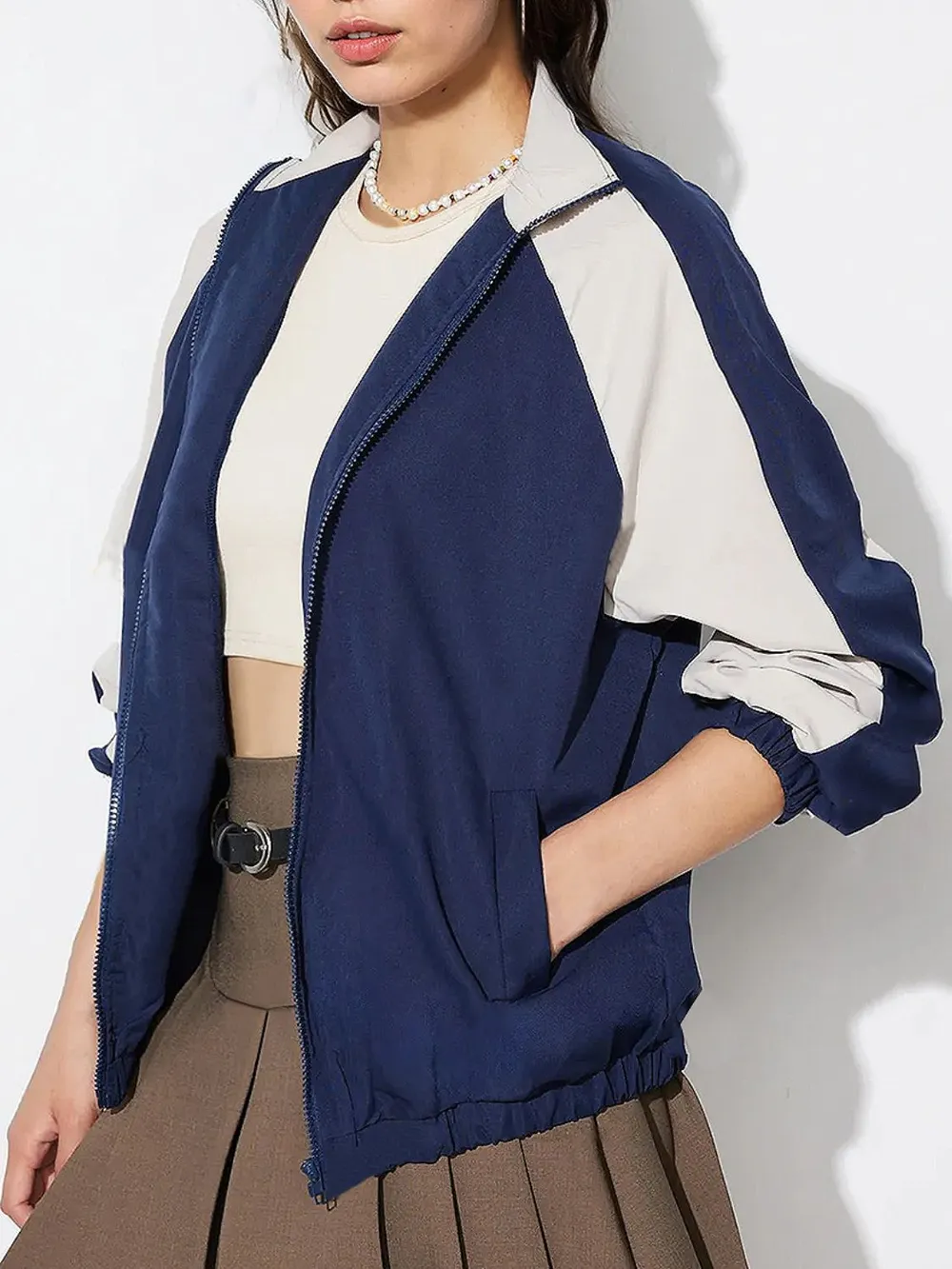 Contrast Zip Up Collared Neck Long Sleeve Jacket