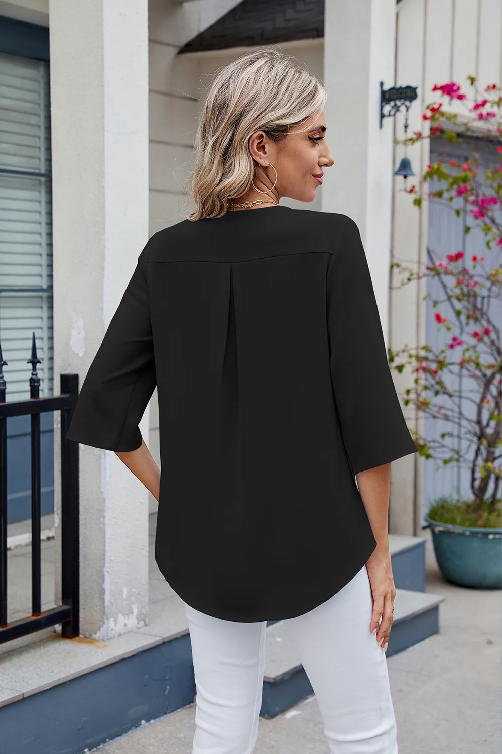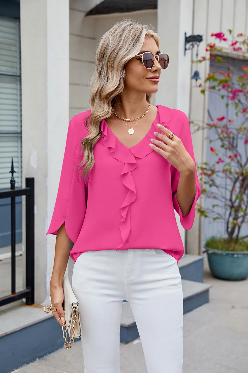 Ruffled V-Neck Three-Quarter Sleeve Blouse