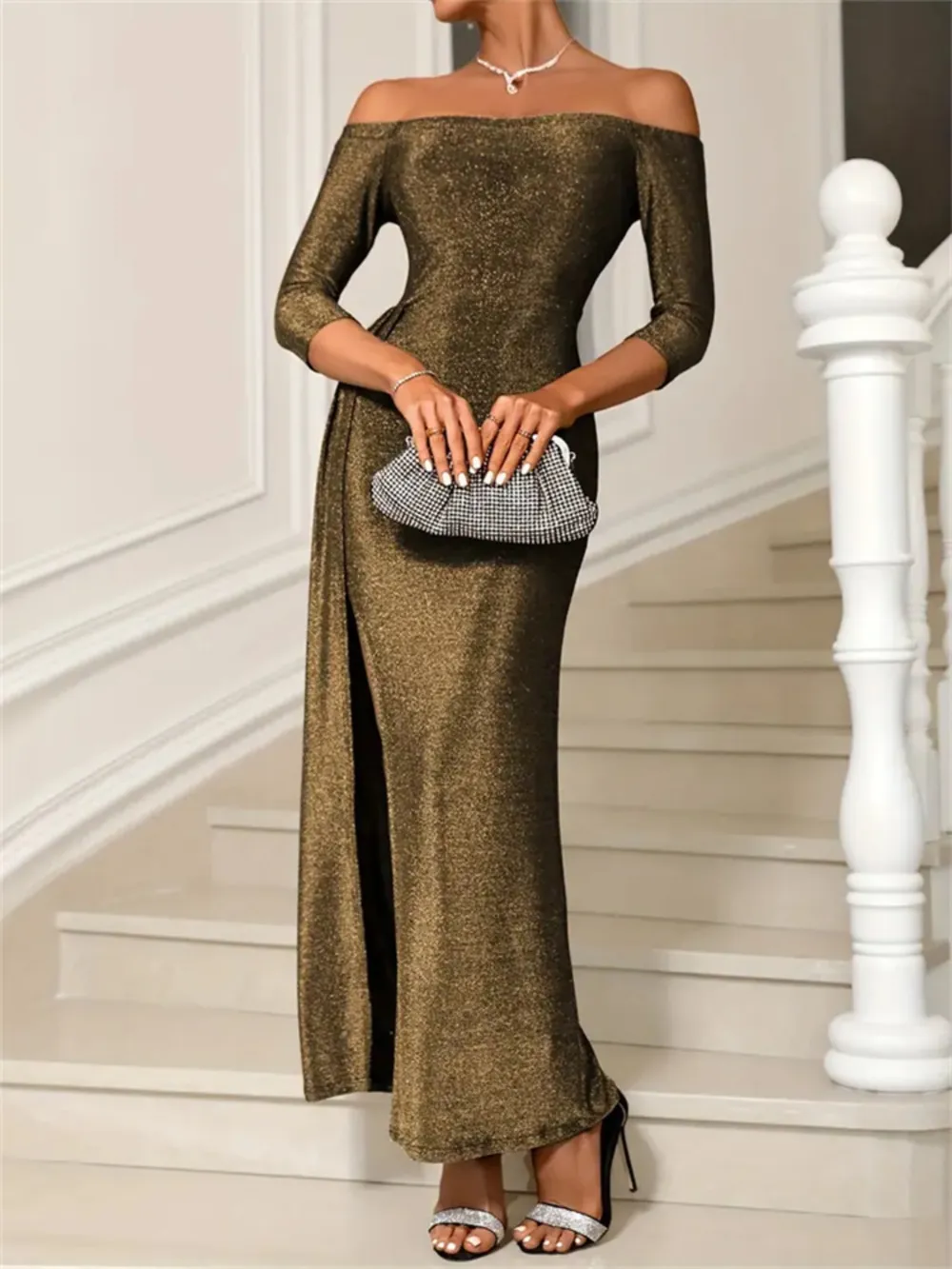 Slit Off-Shoulder Long Sleeve Midi Dress