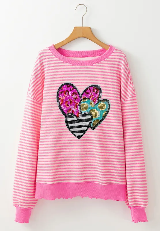 Striped Sequin Heart Round Neck Long Sleeve Sweatshirt