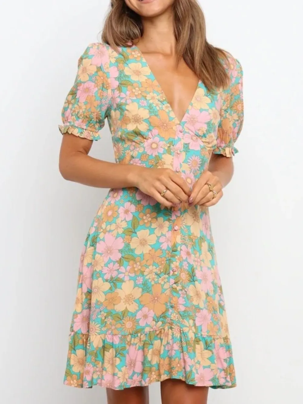 Ruffled Hem Printed Short Sleeve Mini Dress