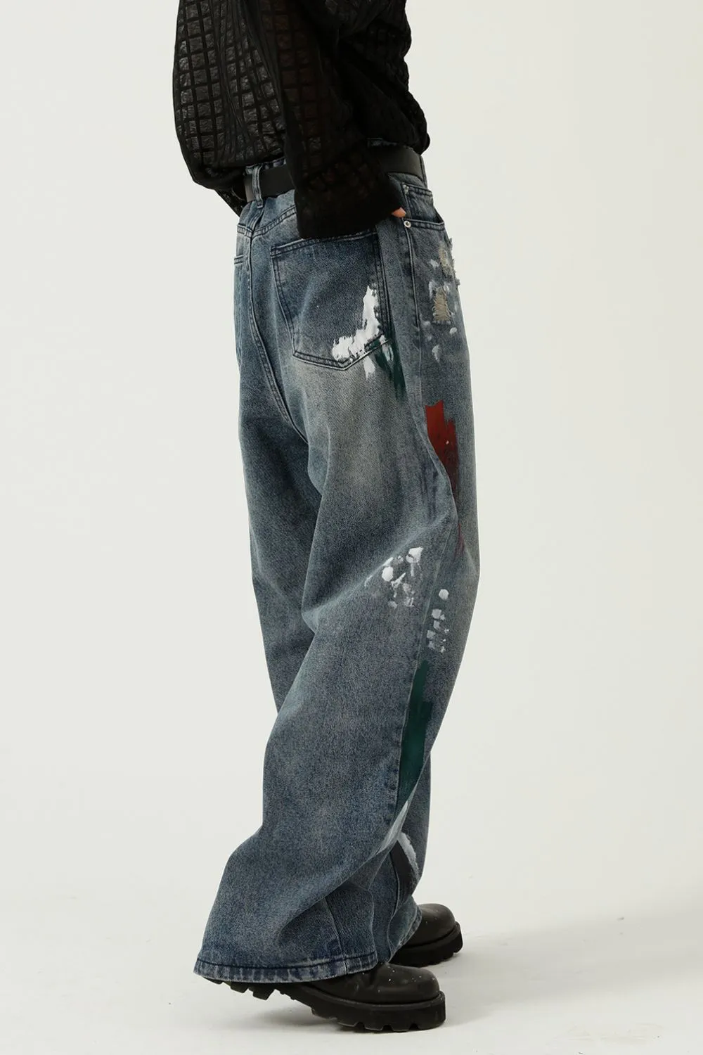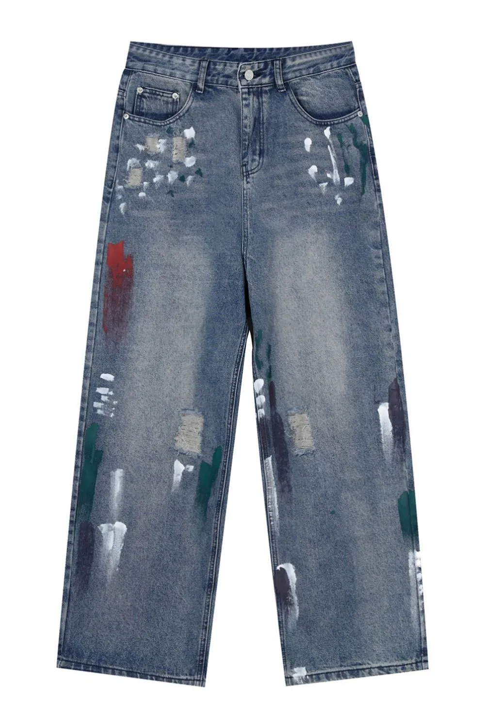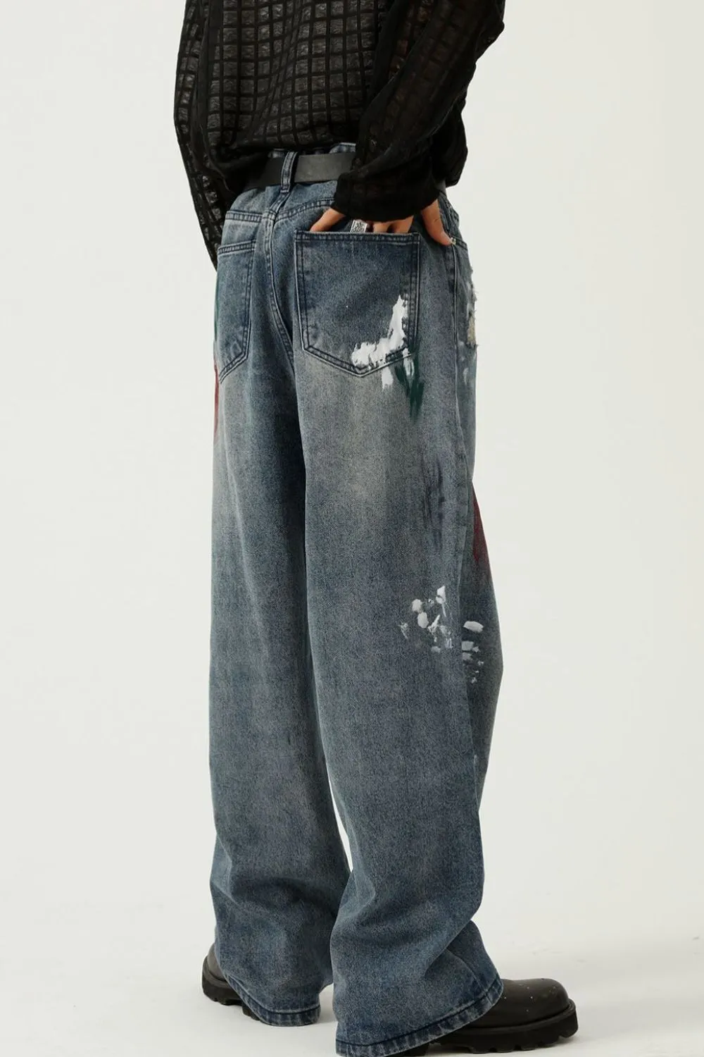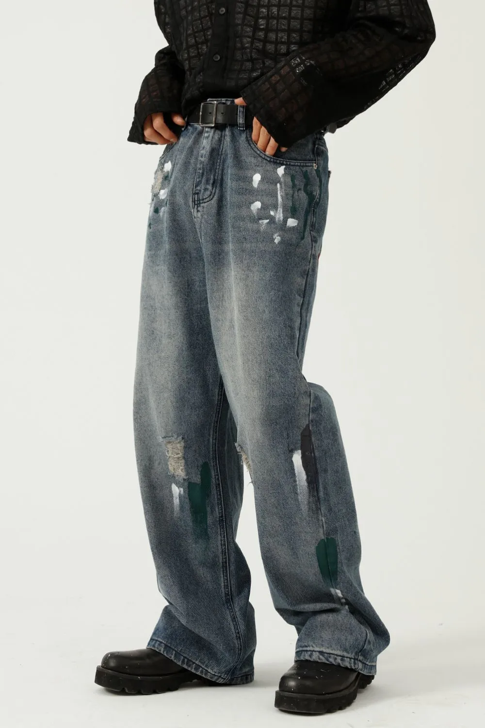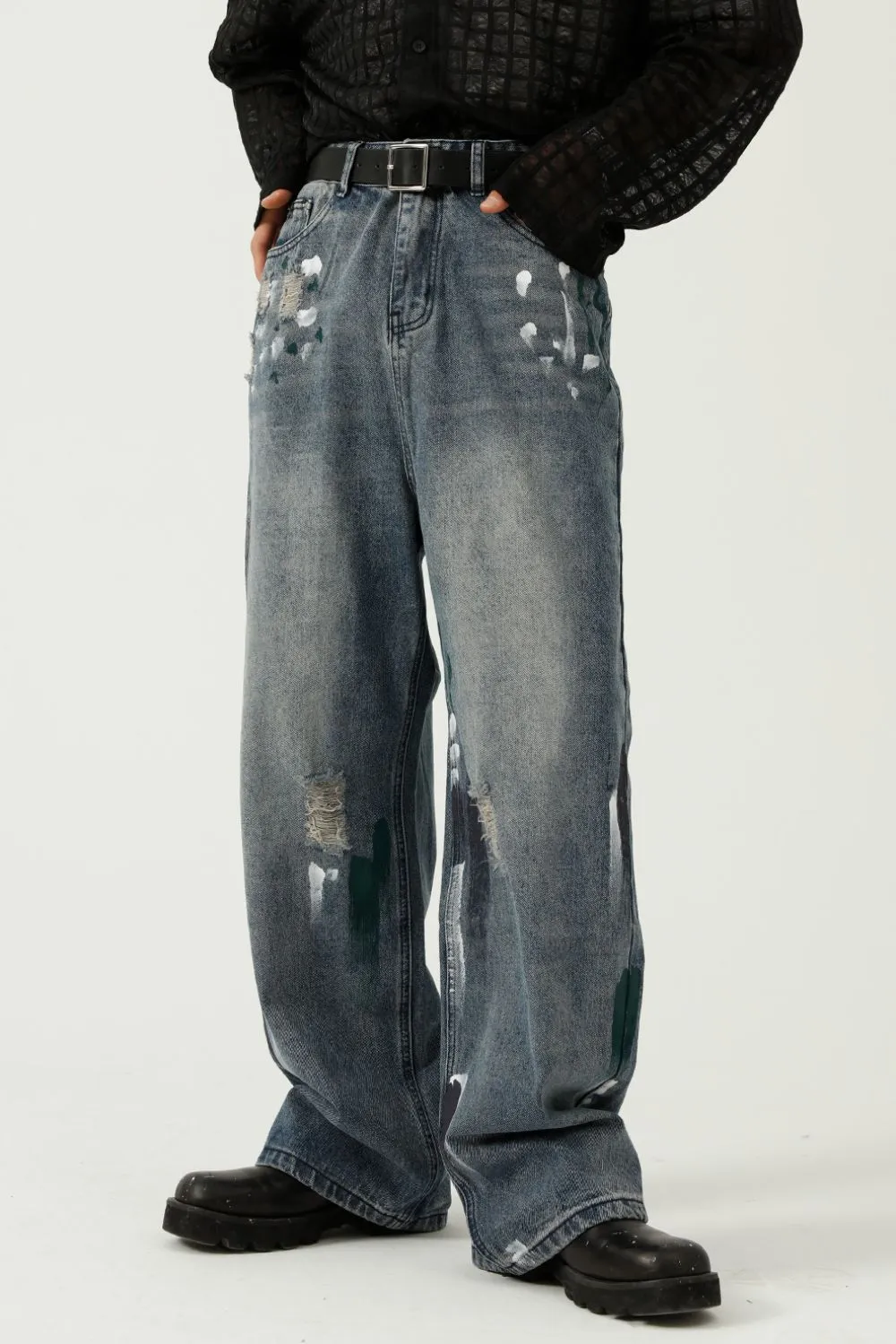Washed Distressed Wide-Leg Jeans