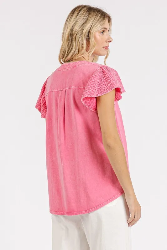 Detailed description of the Mittoshop Mix Media Ruffle Short Sleeve Mineral Wash Top, highlighting quality, design, and unique features that make it appealing to end consumers.