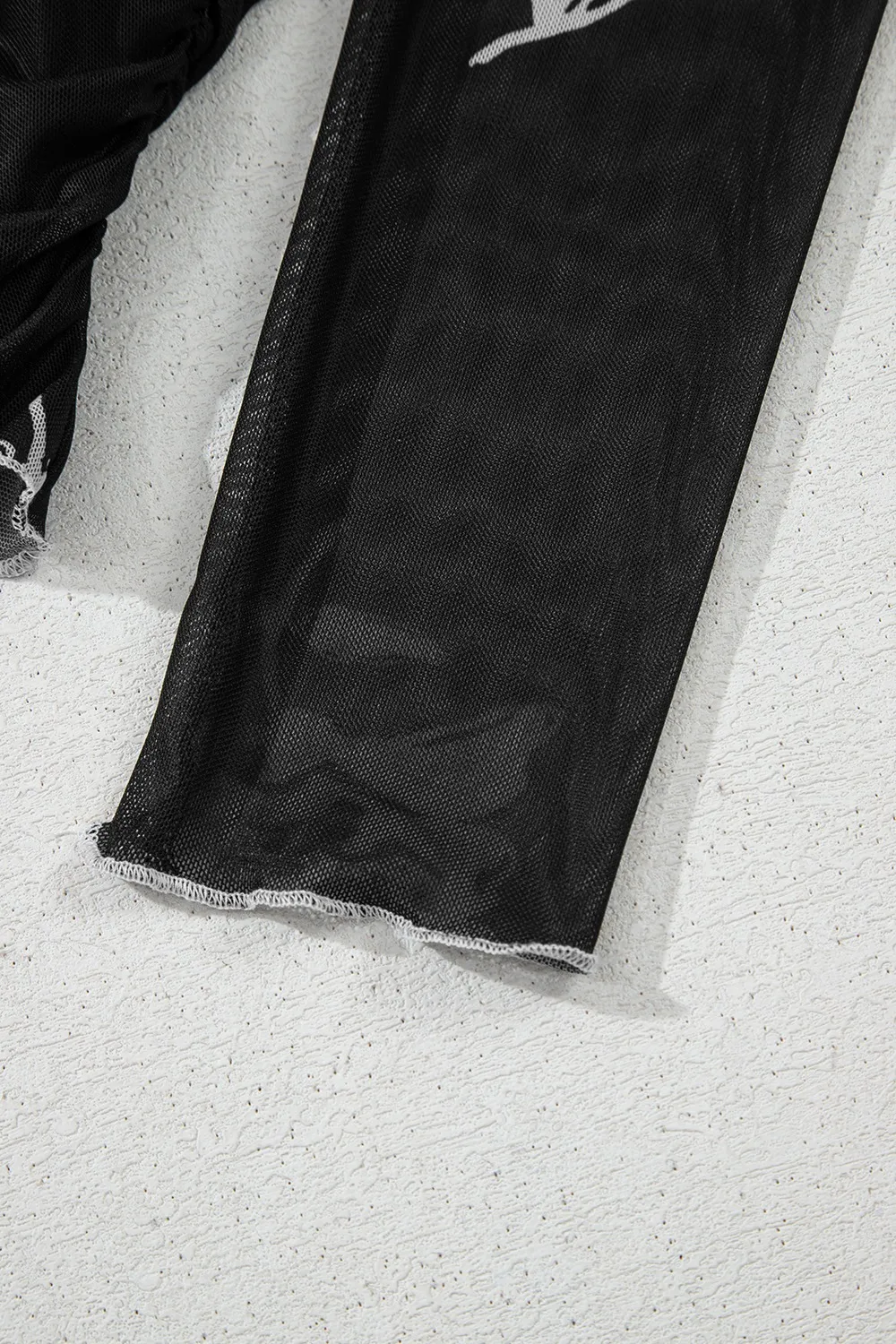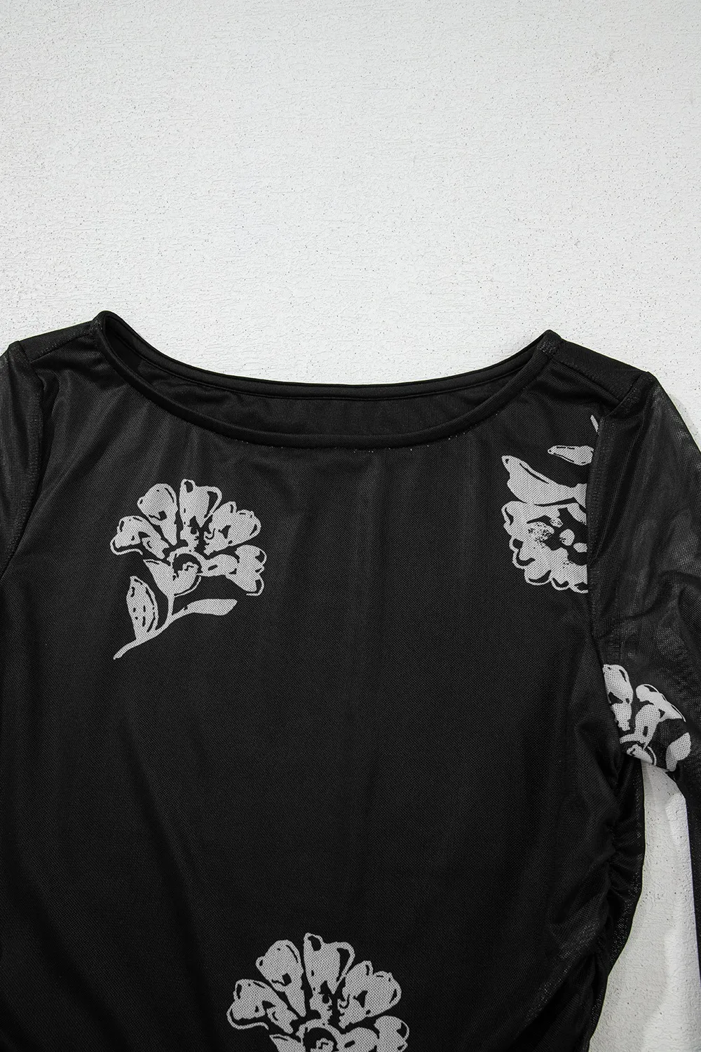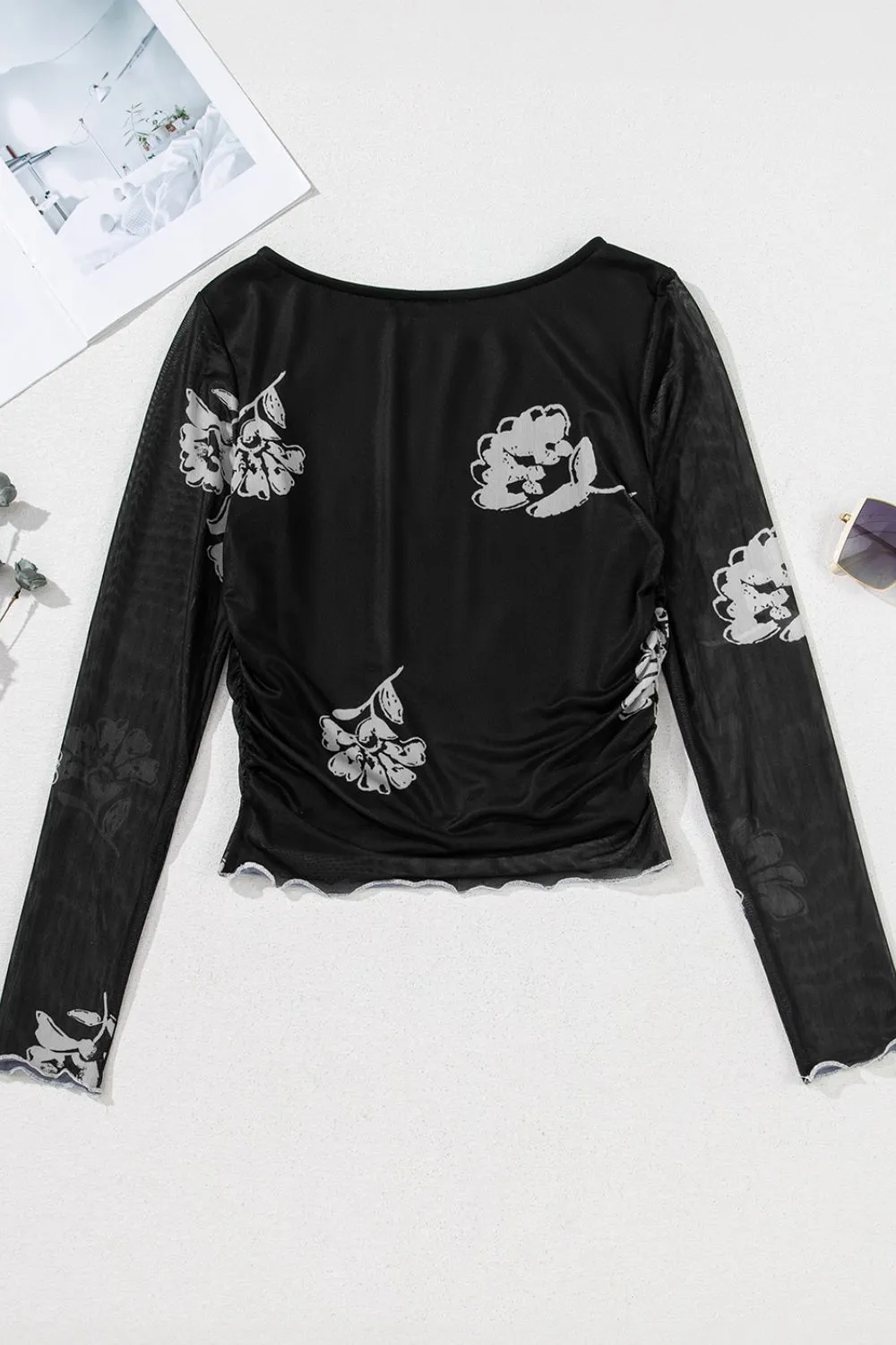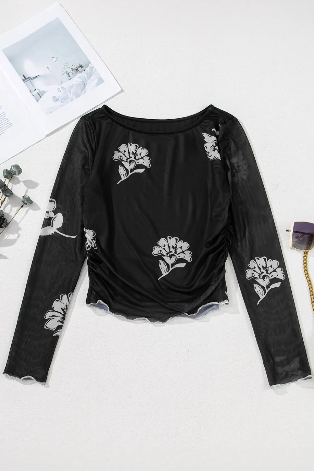 Floral Mesh Lettuce Edge Ruched Slim Long Sleeve Top