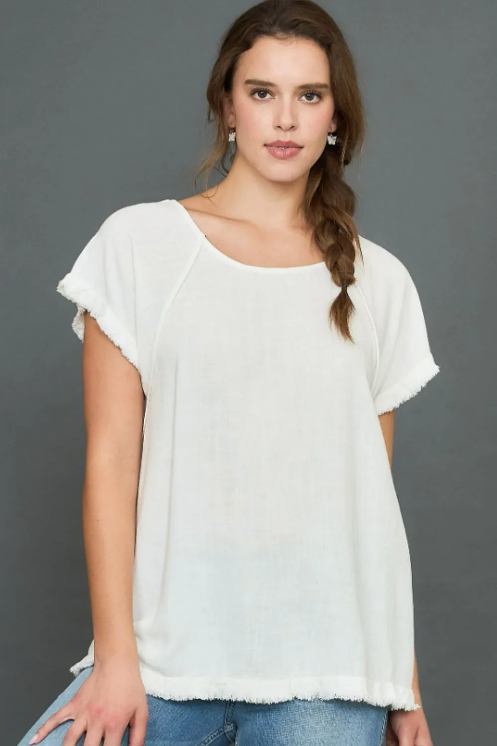 Detailed description of the Umgee Full Size Seam Detail Linen Ruffle Fringe Edge Top Plus Size, highlighting quality, design, and unique features that make it appealing to end consumers.