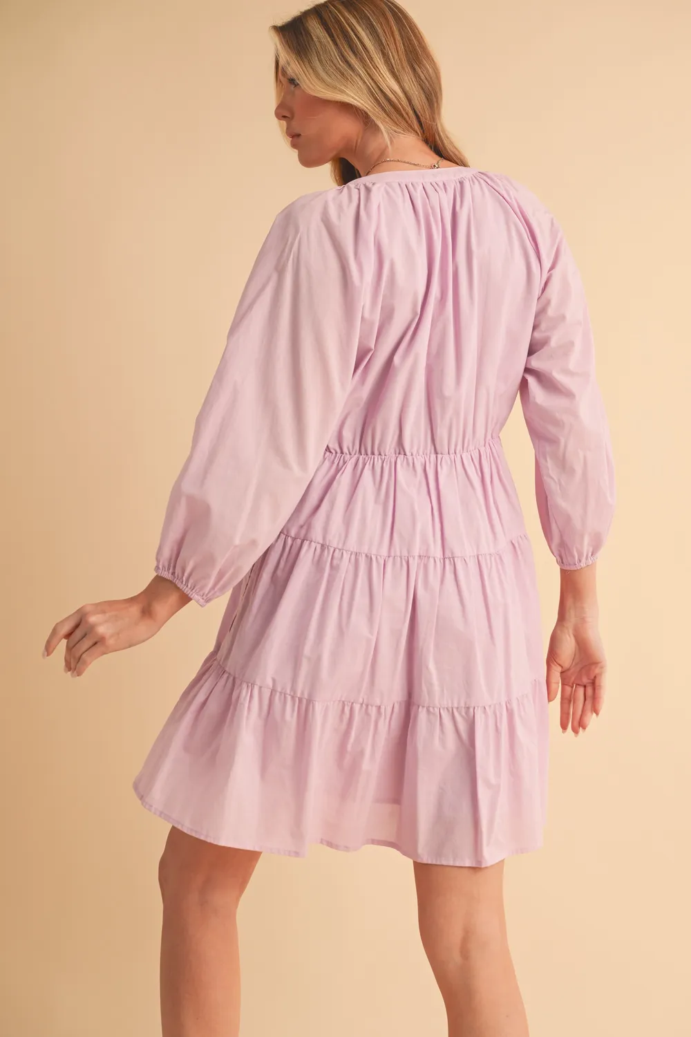 Detailed description of the Aemi + Co Notched Balloon Sleeve Tiered Mini Dress, highlighting quality, design, and unique features that make it appealing to end consumers.