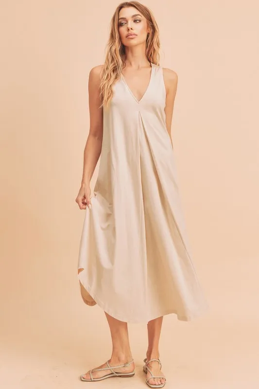 Detailed description of the Aemi + Co Front Pleat Detail V-Neck Sleeveless Midi Dress, highlighting quality, design, and unique features that make it appealing to end consumers.
