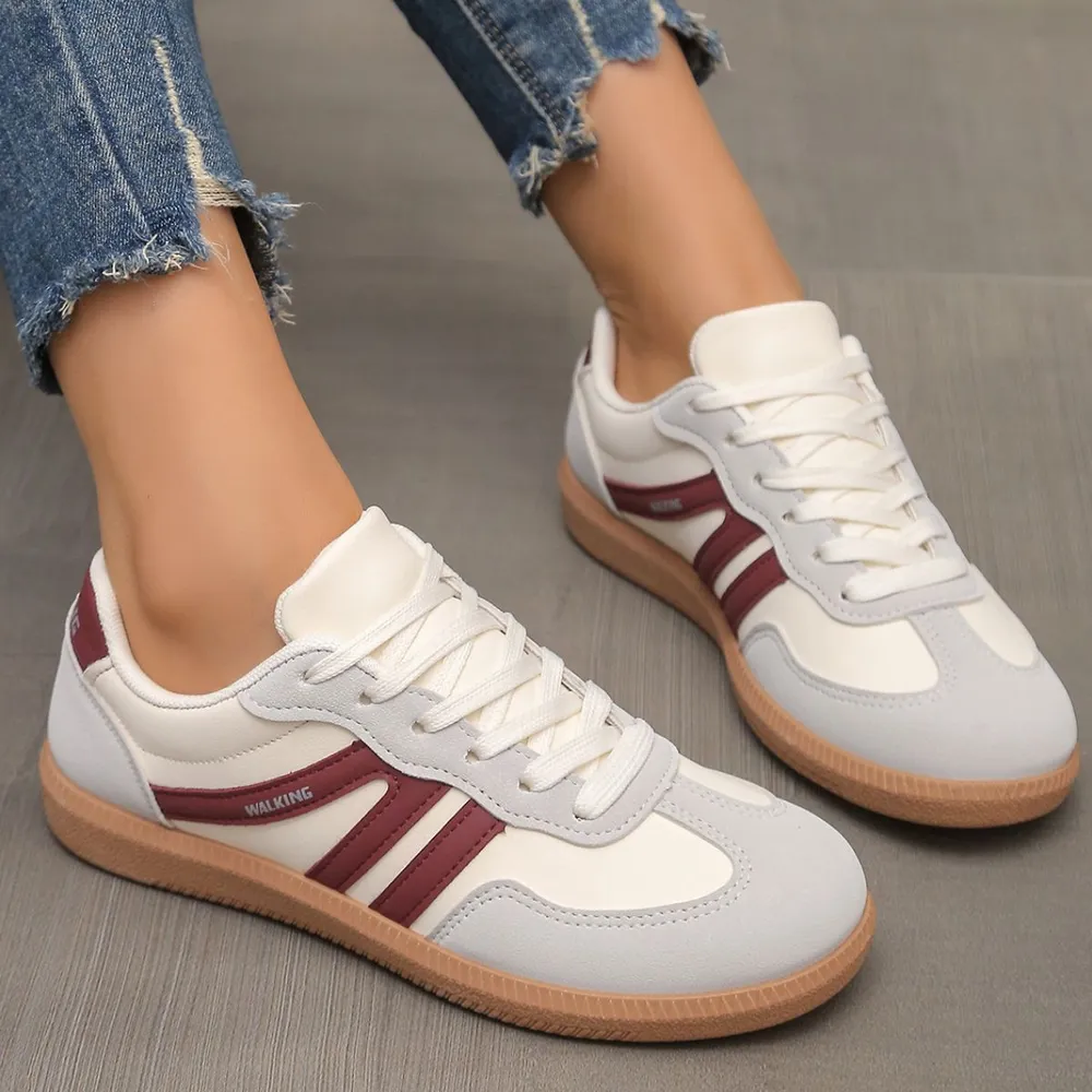 These stylish contrast lace-up sneakers feature a classic black synthetic upper with crisp white stripe detailing that creates a timeless athletic aesthetic. The round toe design provides comfortable wear while the traditional lace-up closure ensures a secure, customizable fit. Built with a durable gum rubber outsole that offers excellent traction and a vintage appeal, these sneakers combine retro styling with modern comfort. The lightweight construction and cushioned insole make them perfect for all-day wear, whether for casual outings or light athletic activities. The breathable upper materials help keep feet comfortable, while the contrasting color scheme adds visual interest and versatility to match various casual outfits.