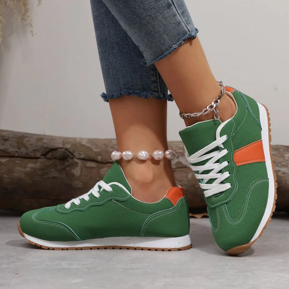 These fashion PU leather sneakers feature a striking green and white contrast design with round toe construction for maximum comfort. Made from high-quality synthetic PU leather material, these flat sneakers offer durability and easy maintenance. The classic lace-up design ensures secure fit while the flat sole provides all-day walking comfort. Perfect for casual outings, these versatile sneakers combine style and functionality with their eye-catching color combination and modern athletic aesthetic. The non-slip rubber outsole provides excellent traction, making them ideal for daily wear activities.