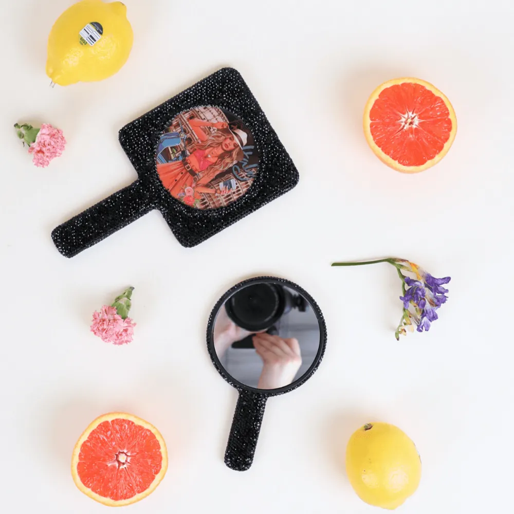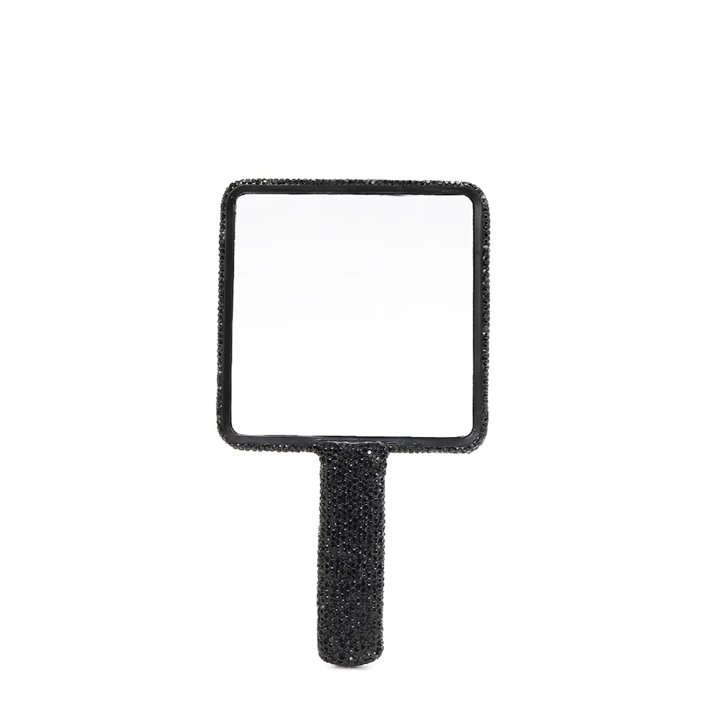 A rhinestone-encrusted plastic rectangle hand mirror is a fashionable and elegant accessory for your beauty needs. The sleek rectangle design adds a modern touch, while the rhinestones provide a glamorous and sophisticated look. This hand mirror is perfect for carrying in your purse for quick touch-ups on the go, and its stylish appearance makes it a beautiful addition to your vanity or dressing table.
